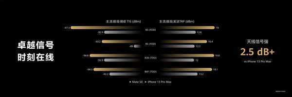 在此前的华为发布会上,余承东还介绍,相较于iPhone13ProMax,Mate50在B3(FDD)、B5(FDD)、B39(TDD)、B41(TDD)主流4G频段接收TIS、发送TRP的天线信号强度方面,比iPhone13ProMax高出2.5dB以上。