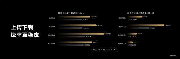 多出3dB就可以说提高一倍,可见Mate50相较于iPhone13ProMax的信号优势接近好了一倍。不仅如此,在上述4G频段弱信号下,华为Mate50的上传和下载速率也比iPhone13ProMax好少过不少。