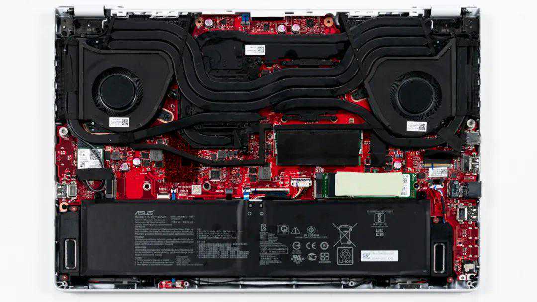 上图是ROG幻15的拆机实拍图,六热管双风扇的组合,其中CPU部分采用液态金属作为导热介质,私自拆解容易泄露造成危险,如需维护建议交给售后。
