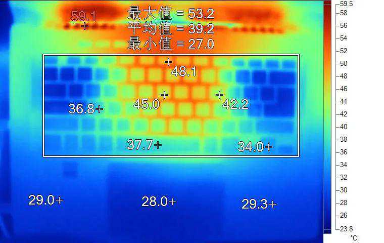 表面温度如上图所示,键盘键帽温度最高为48.1℃,WASD键位区域在36.8℃附近,方向键34℃。背面温度中心点49.2℃。