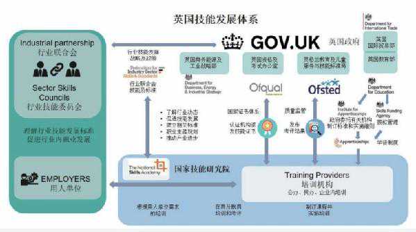 英国技能发展体系。英国各行业均成立有“国家技能研究院”,负责协同政府进行“政策解读、标准制订、证书发放、产业引导及招标服务”。其中,比较活跃的26个“国家技能研究院”联合成立了“英国技能联合会”。这些“国家技能研究院”与产业和院校有着紧密的联系,对院校而言他们提供学校通向产业的窗口和桥梁,对产业而言他们可提供人才培养和选拔的最佳接口。各行业所对应的“国家技能研究院”,也是英国“学位学徒制”的重要推动力量,其在英国职业教育和技能发展方面起到了重要的引导作用。