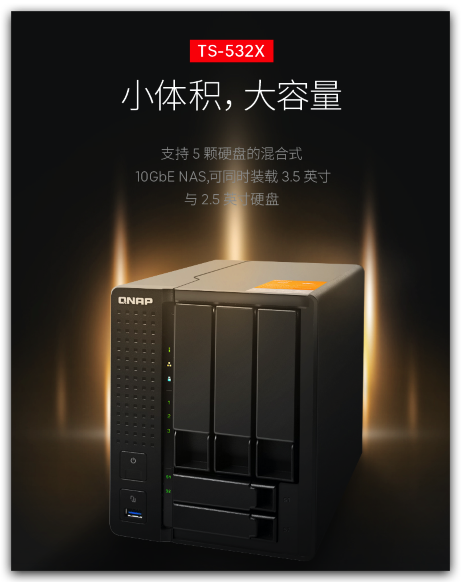 威联通TS-532X——最便宜的万兆NAS(3000元以内)TS-532X我在上文中多少有提及,是最便宜的万兆NAS,入门级万兆网络组建的必备一环,性价比超高!TS-532X是5盘位NAS,其中2个2.5英寸盘位,3个3.5英寸盘位。这款机型使用了ARM构架,虽然可玩性不高,但作为万兆文件存储服务还是非常不错的。关于万兆的相关内容我在下个章节详细讲解这里就不多介绍了。双十一目标活动价2200左右,有万兆需求的小伙伴值得剁手。