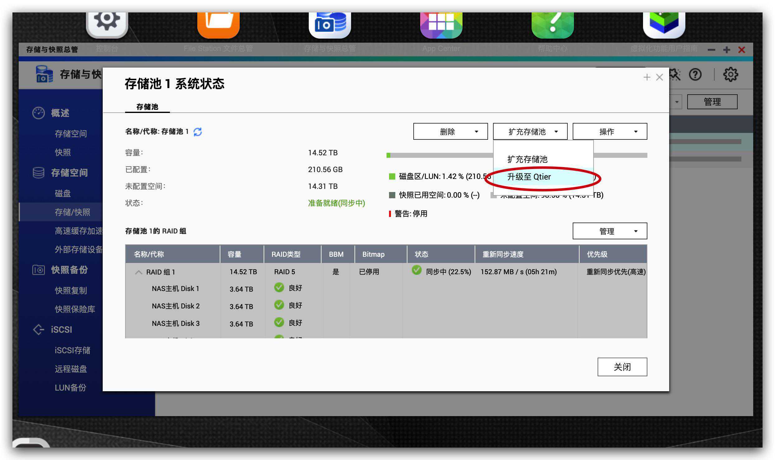 ▼NAS虽然能够提供万兆的硬件,但正如我上文所说想要跑出万兆的速度还必须要有磁盘组的支持。传统的3.5寸硬盘传输速度普遍在100MB/S——200MB/S之间,即便5盘位raid5也很难达到满速万兆,因此我才在932X中使用了SSD进行加速。为了能够最大化提高SSD的性能和安全可靠性,我选择将4块金士顿A400组建为Raid10磁盘阵列加入到Qiter中。