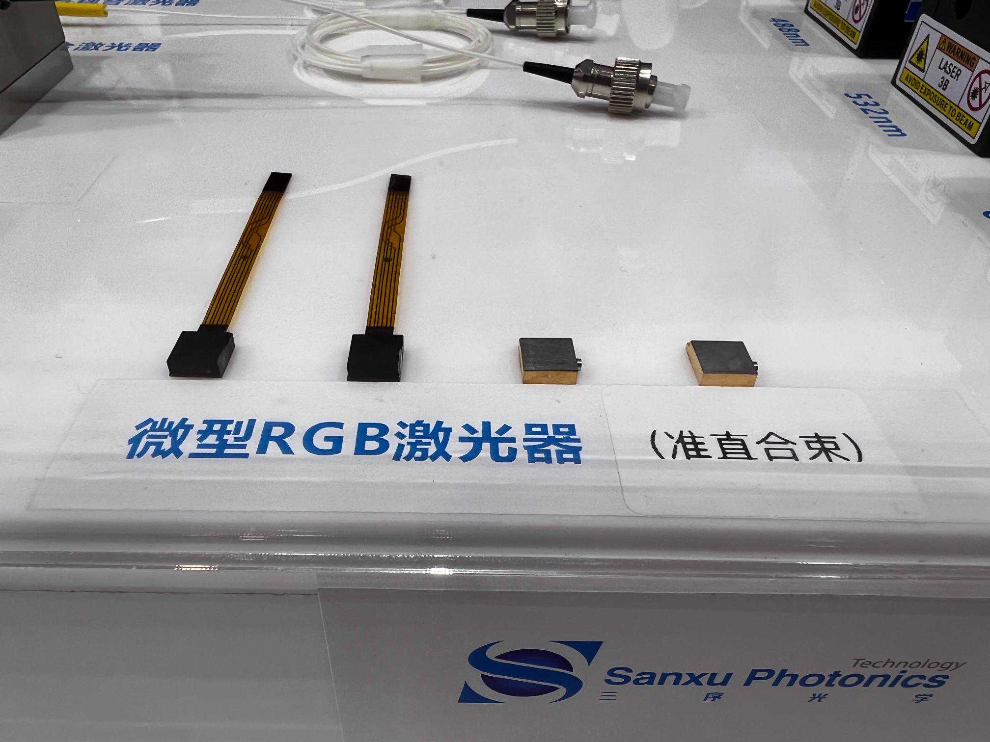三序光学展示了多款激光器,其中针对空间光输出展示了微型RGB激光器,体积小于0.1立方厘米,使用R、G、B激光二极管提供高亮度全彩激光输出的激光光源产品,可应用于AR、生命科学、国防与工业等领域。