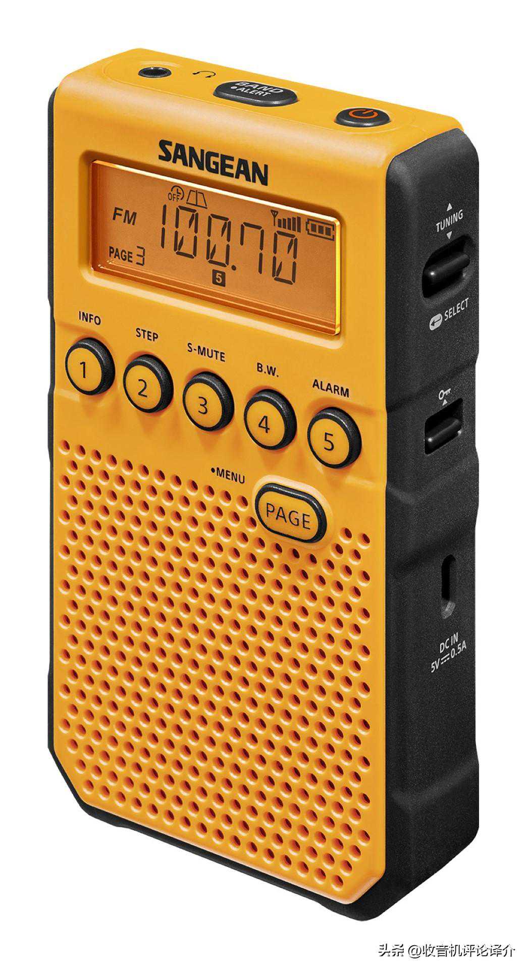 DT-400W容易让人想起索尼的老式运动随身听系列收音机,亮黄色的机壳非常可爱。在我收藏的小尺寸口袋机中,它能跻身中波最佳行列。它主要是为了使用耳塞收听而设计的,所以,内置了一个很小的喇叭,带有数字调谐频率功能、NOAA气象波段、不错的调频调谐器,还有一个重低音增强开关,重低音效果取决于你用的耳塞品质。如果你想要一台随身听风格的中波收音机,强烈推荐此机。它还有一个方便拆卸的腰带夹,不过,圆润的机壳底部表明它无法直立起来使用。调频选择性不如前文中的山进DT-160或CC-Pocket。