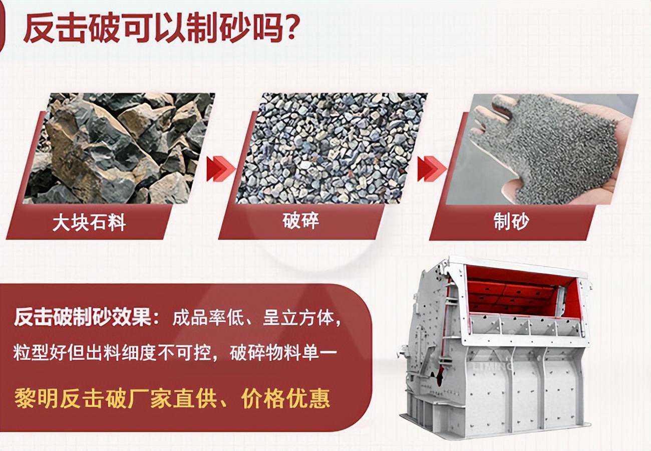 反击破是可以制砂的,但是根据目前的生产实验得到的数据,基本可以达到制砂的效果,反击破的制砂率大概在30%左右。毕竟不是专业制砂设备,如果对机制砂成品要求比较高的话,建议后续还是再加一台专业制砂设备。
