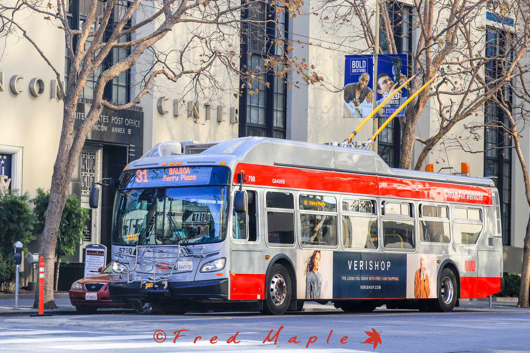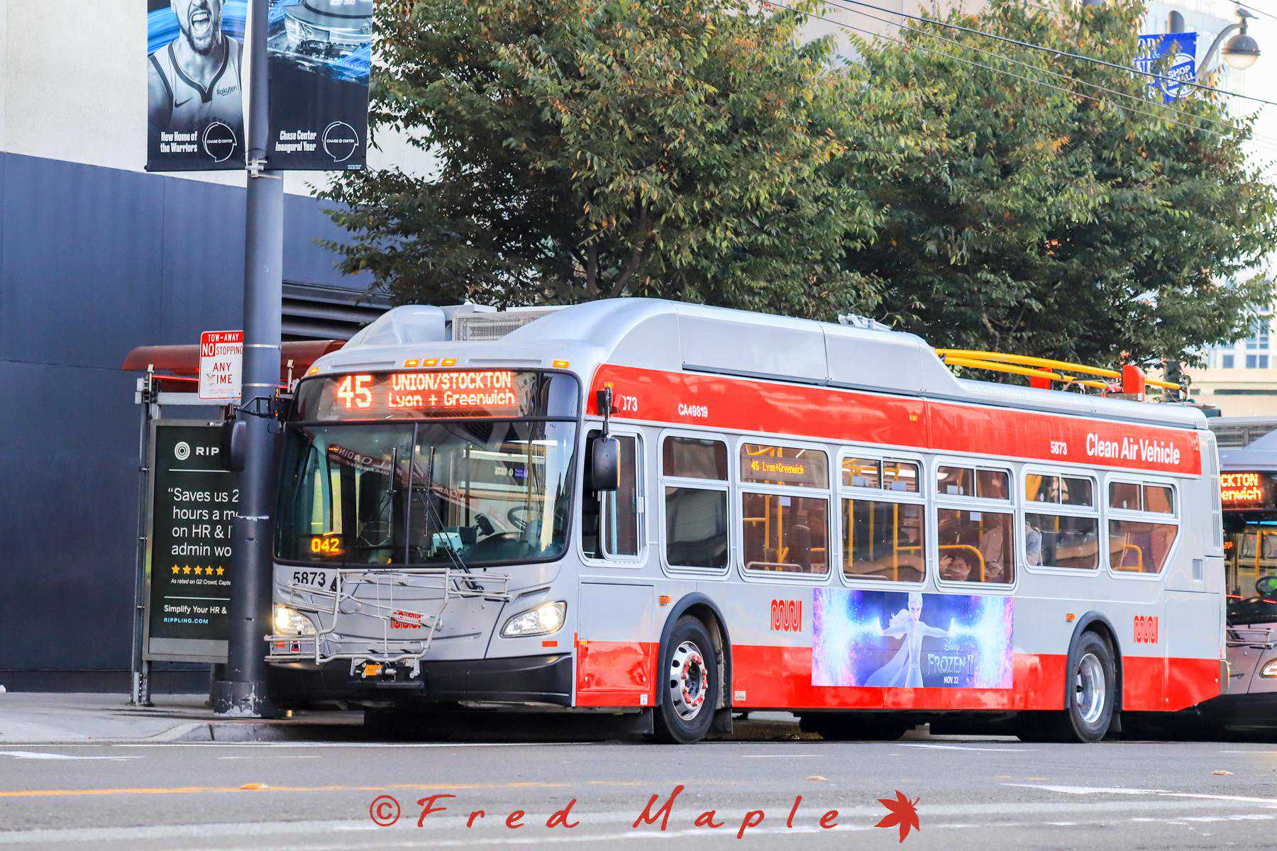 无轨电车线路包括1/2/3/5/5R/6/14/21/22/24/30/31/33/41/45/49,其中30/33/49目前使用汽车代运。再说句题外话,MUNI的线路号编排很有水平,将线路很明确的划分为Local/Rapid/Express三个层级,Local即为普通站站停靠的线路,Rapid(R)是大站快车,在旧金山是简配版BRT,Express(X)是有直达性质的快线,站点和客流均呈哑铃型,中间跨站的区域多使用快速路。而国内目前大部分的快线是不分Rapid和Express的,BRT开的像Local