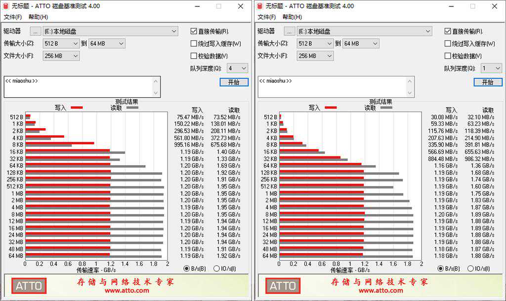 ▼ATTODistBenchmark也有队列深度的选择,分别设置为4和1。QD4的测试明显要好一些,尤其是小文件的速度。