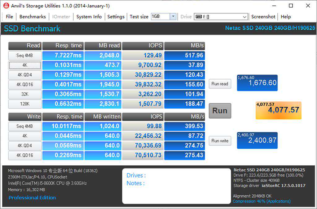 如果只是比CrystalDiskMark、ASSSDBenchmark、ATTODistBenchmark、Anvil'sStorageUtilities、TxBENCH的测试数据,其实N530S240G和高端的产品差不了多少。不过通过PCMark8的测试可以看出,N530S240G只能算是入门级产品,和高端产品还是有一定差距。当然高端产品的价格不菲,一分钱一分货永远是真理。