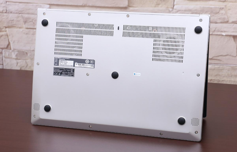 说回本子,D壳同样是金属材质,不过并没有像A壳C壳那样使用拉丝工艺,一左一右两个对称的散热窗可以清楚看到散热风扇。使用金属D壳的轻薄本,在拆装D壳的过程中很容易造成D壳变形,五个垫脚的设计可以避免垫脚不平以及因此产生的共振。