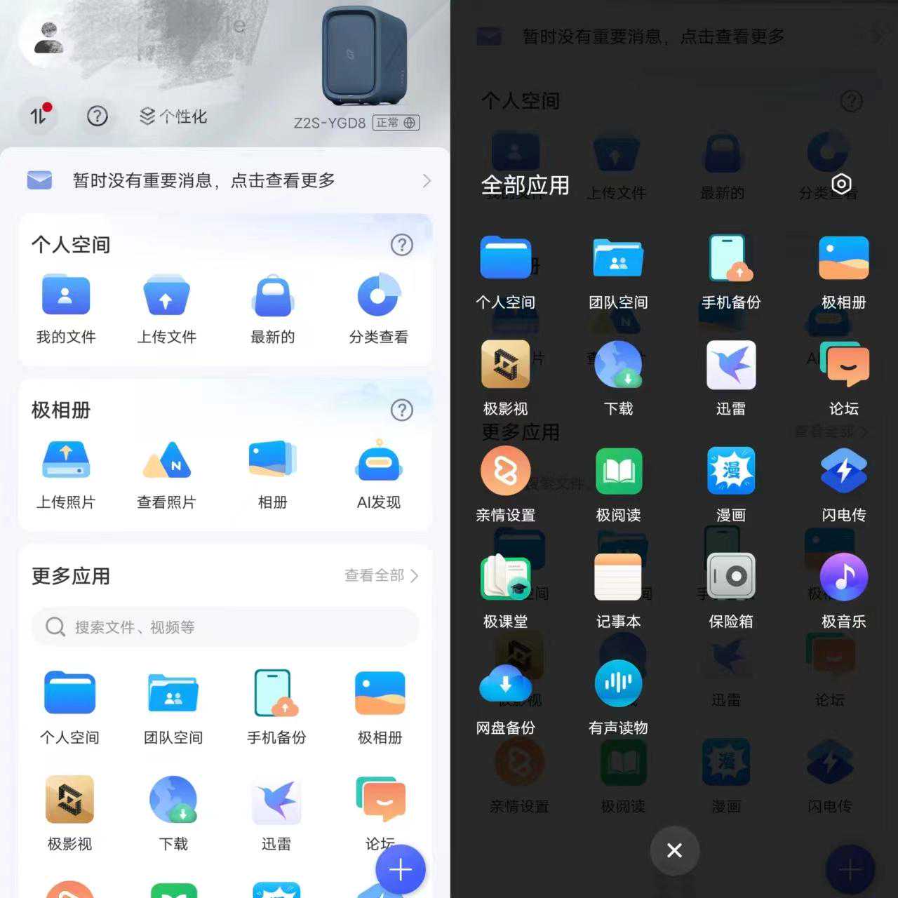 而极空间设计之初就是为了新手准备的,所以极其简单,只要下载一个APP就能轻松上手,从系统体验而言,极空间的系统做的比较全面,而且更新优化也进行的特别快,且系统底层逻辑梳理得比较好。