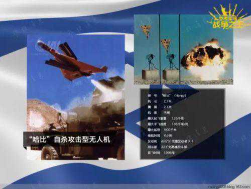 除了传统的无人侦察机外,IAI还于20世纪90年代推出了独特的“哈比”(鹰身女妖)反辐射无人机(巡飞弹),其最大巡航时间6小时,配备被动雷达寻的头,在发现目标后,会自主选择以自杀俯冲攻击的方式与目标同归于尽。