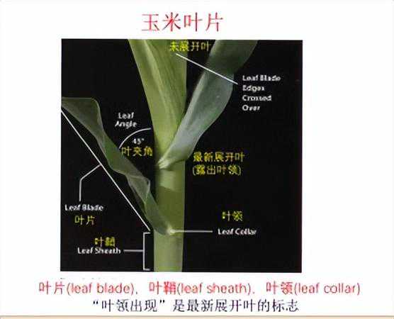 下面进入第一部分,关于玉米生长发育规律的内容。首先,请大家查看我群里发布的这张照片,这里我将定义一下什么是玉米生长发育规律的主要线索。我的主线是以叶龄为基础,即通过数叶片来判断。我们数的是完全展开叶。那么,什么是完全展开叶呢?从图片中可以看出,要达到完全展开的状态,必须满足三个条件:首先,叶片存在;其次,有叶鞘;最重要的是,叶片与叶鞘的连接处,即叶领,必须完全展开。只有满足这些条件,叶片才被称为完全展开叶。后续的一系列生育时期都与完全展开叶有直接关系。