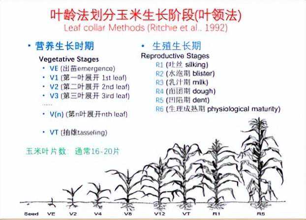 根据完全展开叶片的数量,我们将玉米的生长发育时期首先分为两个阶段:第一阶段是营养生长。以V表示,例如,V1代表第一片完全展开叶,依此类推,V2、V3直至VT,分别代表不同的生长阶段,VT代表抽雄期。