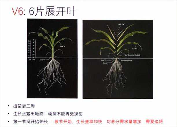 紧接着,下一个时间节点是V6,即第六片叶片完全展开。这个时期,按照传统的时间计算,是出苗后的第三周。在V6时期,生长点开始露出地面,因为此时开始进入拔节期,即地表第一个结节开始向上生长,将生长点顶出地面。如果在此时受到伤害,会影响到生长点的生长,对植株的生长的影响是非常明显的,同时从拔节期开始,玉米植株的生长速率、干物质累积以及对养分的需求均加快。在这个时间节点,日常养分管理需要进行追肥。同时,在拔节期,从V6开始,植株体内的雄穗和雌穗已开始分化。
