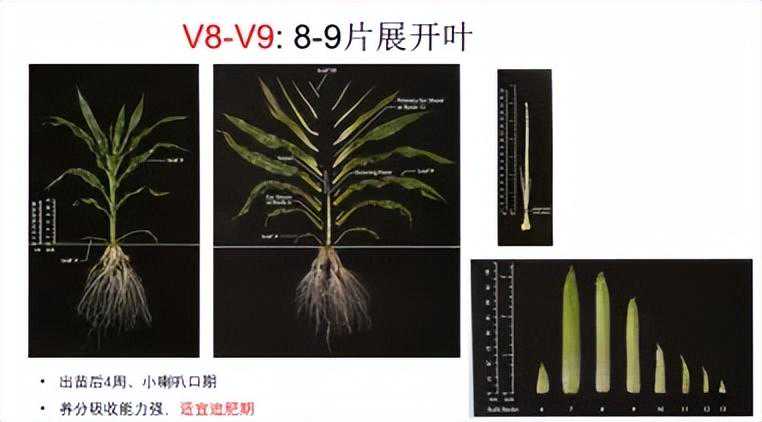 接下来的时期是八到九片展叶,这与传统生育时期中的小喇叭口期相对应。这一时期通常出现在出苗后的第四周。在此期间,养分吸收迅速,干物质快速累积,这也是追肥的关键窗口期。