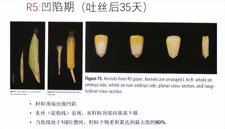 接下来的时期被称为凹陷期,发生在吐丝后35天。在这个时期,玉米籽粒的顶端会出现凹陷,这一现象当然也受到品种的影响。同时,乳线开始形成,可以通过观察乳线位置来判断籽粒的灌浆进度。在此期间,一个关键指标是,当乳线位于籽粒中部时,籽粒的干物质重量实际上已经达到最后完熟期时期的90%了。