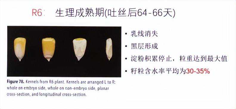 最后一个时期是生理成熟期,其典型特征是黑层的形成和乳线的消失。黑层的出现和乳线的消失代表了淀粉累积的停止和籽粒的灌浆完成。在成熟时,籽粒的含水量通常与品种有关,大多数常规品种的含水量在30%到35%左右。