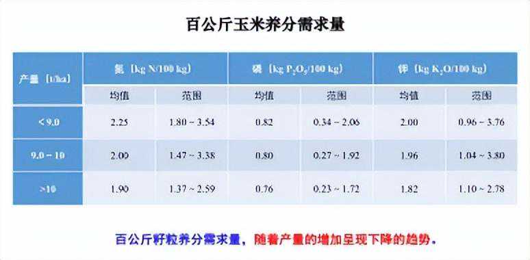 另一个表征玉米养分需求量的指标是每百公斤籽粒的养分需求量,即生产100公斤(200斤)玉米所需的氮肥量。以氮肥为例,当产量为200斤时,9吨水平的条件下需要2.25公斤氮肥;在9到10吨水平时,200斤玉米需要2公斤氮肥。当产量超过10吨,即在10吨、11吨、12吨等更高产量水平时,200斤玉米的氮肥需求呈现下降趋势,但后续数据没有提供更详细的细分。在10吨以上产量水平生产200斤干玉米,氮肥需求约为1.9公斤。同样的趋势也适用于磷肥和钾肥。