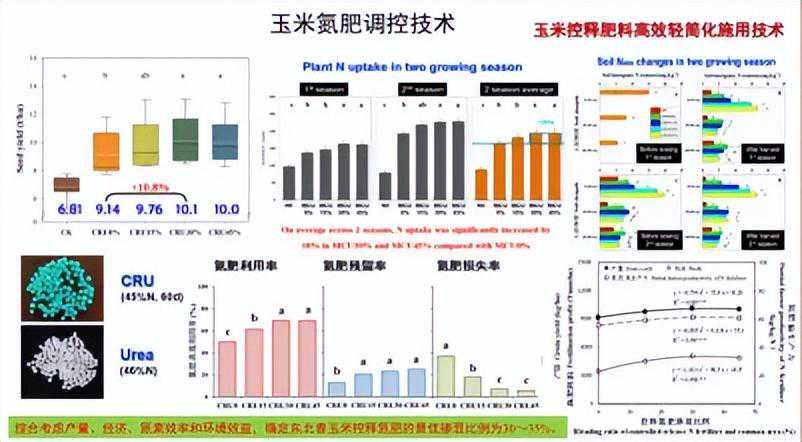 针对当前农户普遍采用的一次性施肥生产需求,我们在梨树开展了一些实验。比如构建以包膜控释技术为核心的一次性轻简化施肥技术,特别是采用聚氨酯包膜的控释尿素。我们进行了不同添加比例的田间实验,比例包括百分之十、百分之十五、百分之三十和百分之四十五。综合考虑了作物产量、氮肥利用效率、收获后作物无机氮残留比例以及经济学原理,即随着添加比例的增加,成本也会相应提高,得出了最终的结果。控释氮占总氮的比例最佳组合为30%-35%。