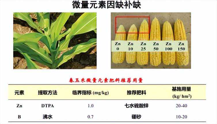 关于锌的养分投入,技术是基于土壤测试的阈值。土壤中的速效锌通过螯合剂提取后,如果锌的含量小于1毫克每千克(即1ppm),则表明存在锌的缺乏。此时,需要施用20到40公斤每公顷的七水硫酸锌。如果出现缺锌症状,也可以通过叶面肥喷施来改善。