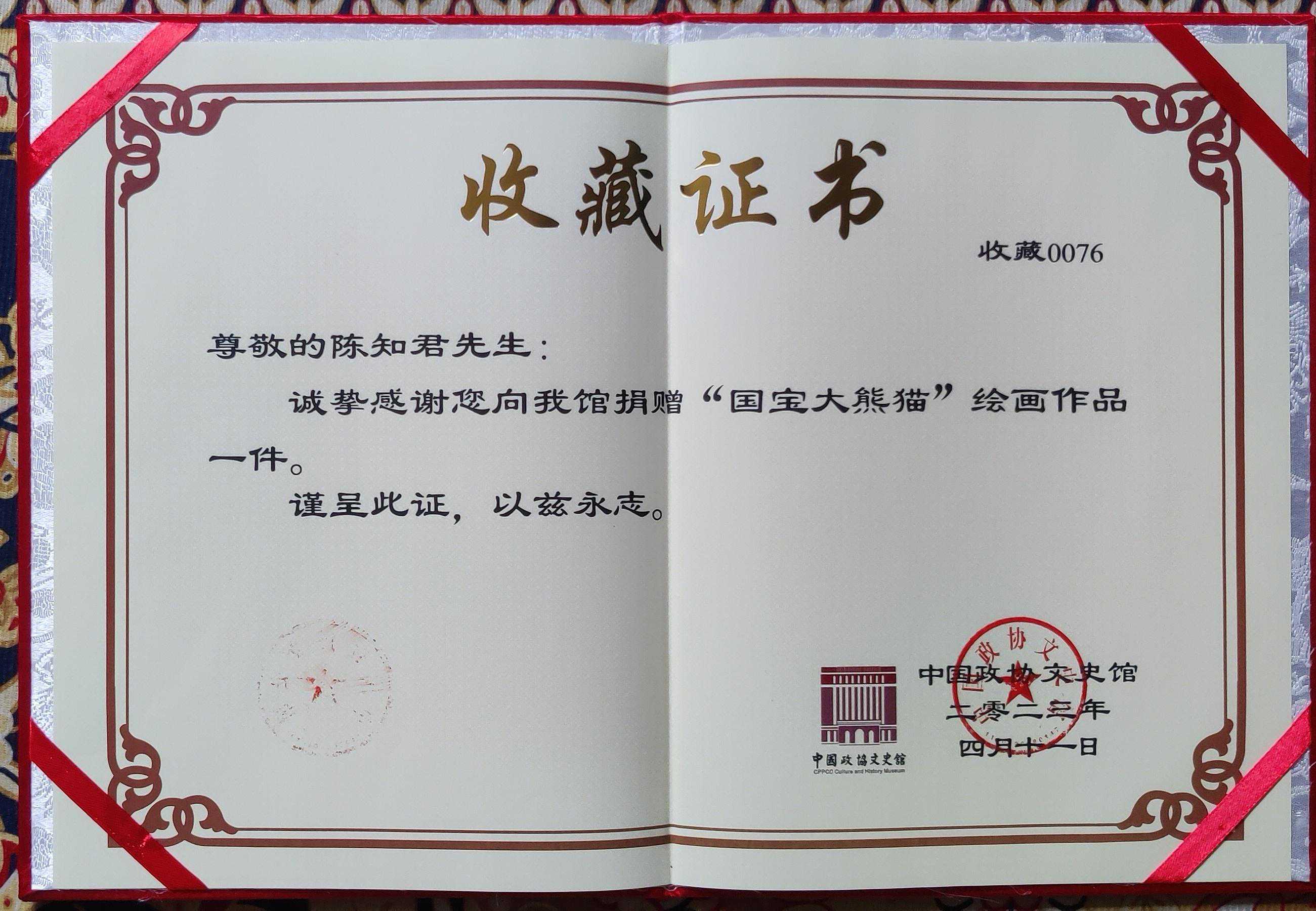 2023年4月陈知君的油画作品《国宝大熊猫》入选中国政协文史馆典藏。