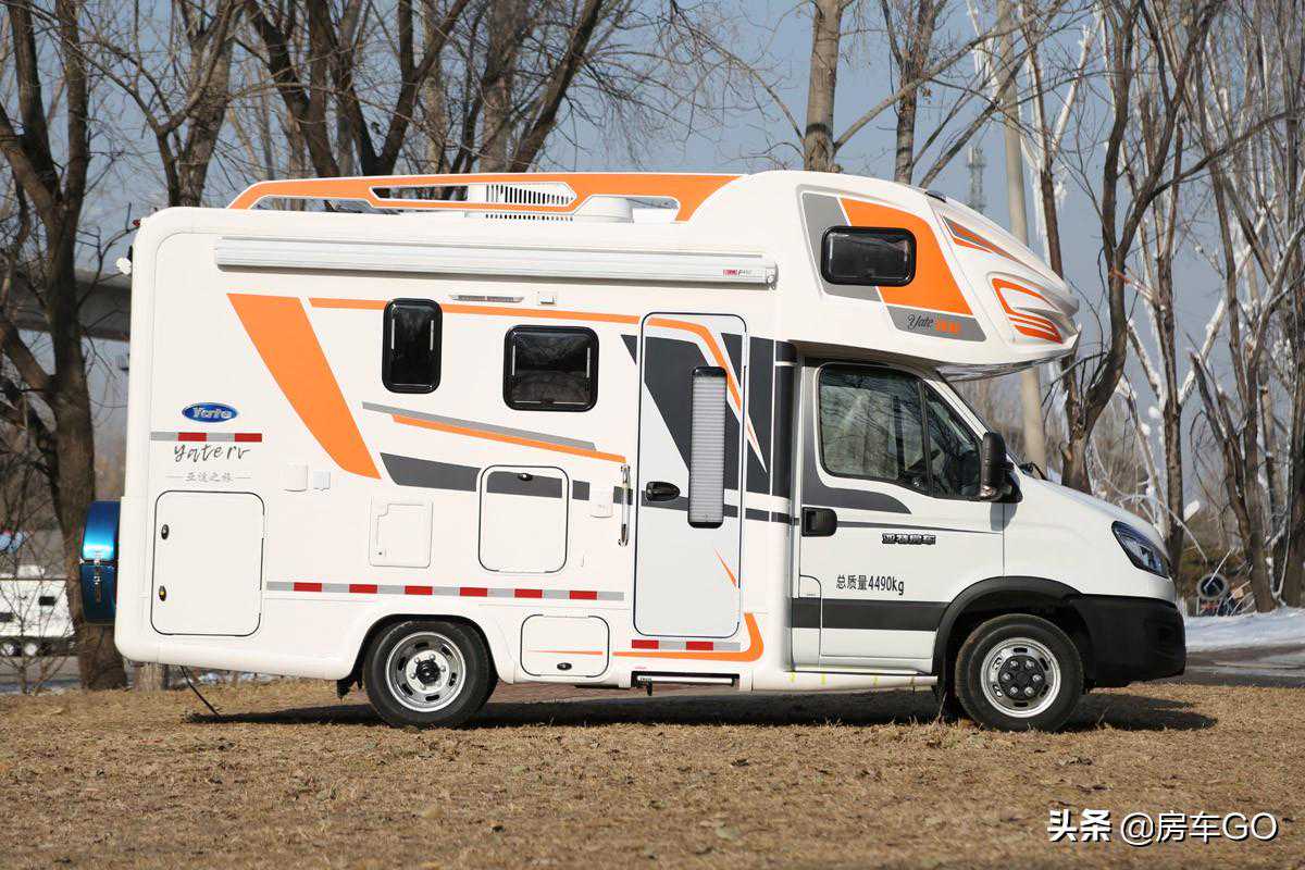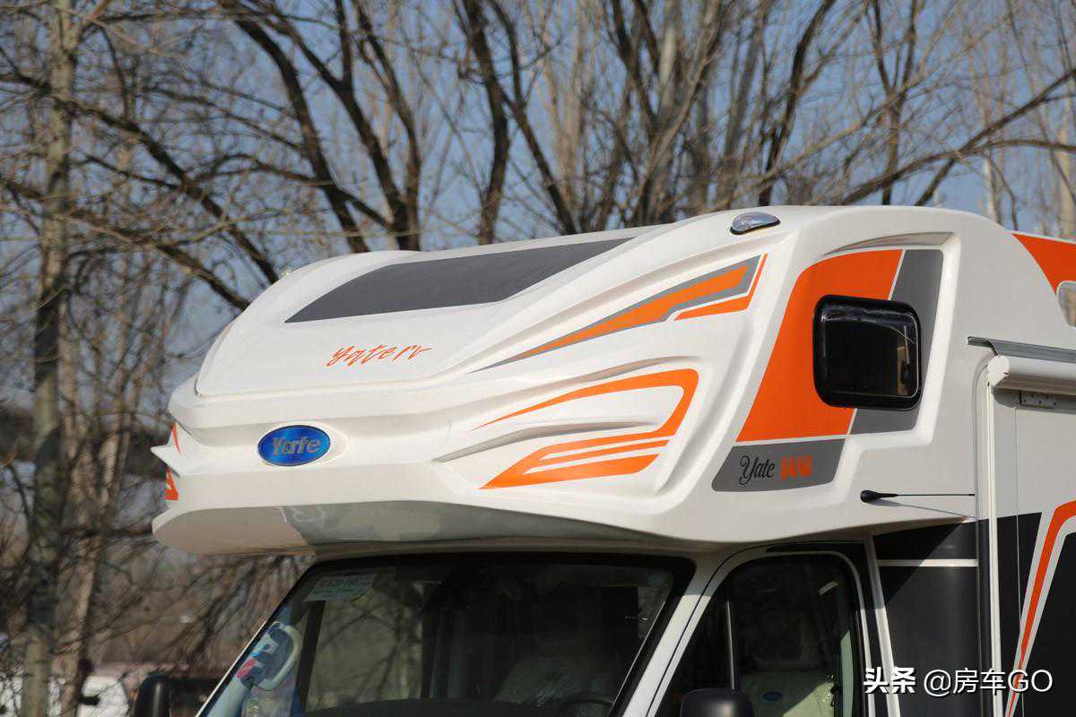车身正面可以看出整车造型方正,额头部分像戴了一顶厚厚的“帽子”,由于C型房车车身的加宽,后视镜也进行了相应增长,驾驶员对后方视野把控更轻松。