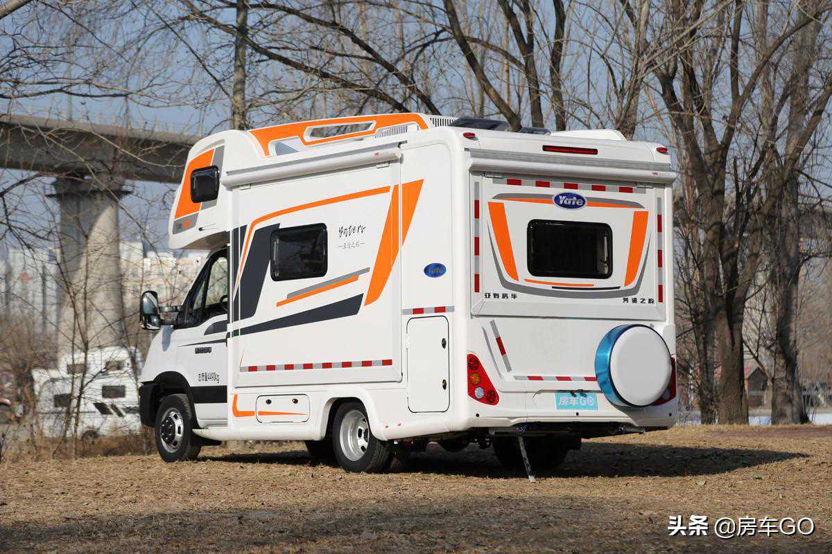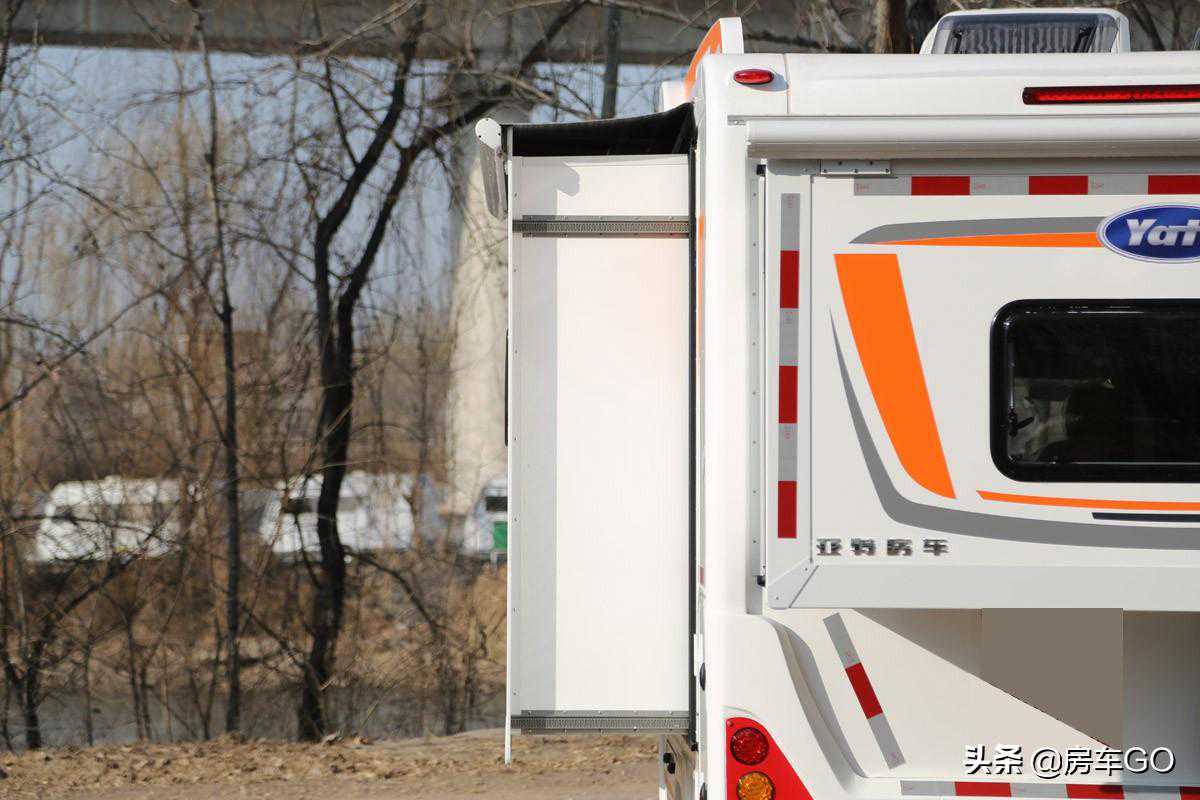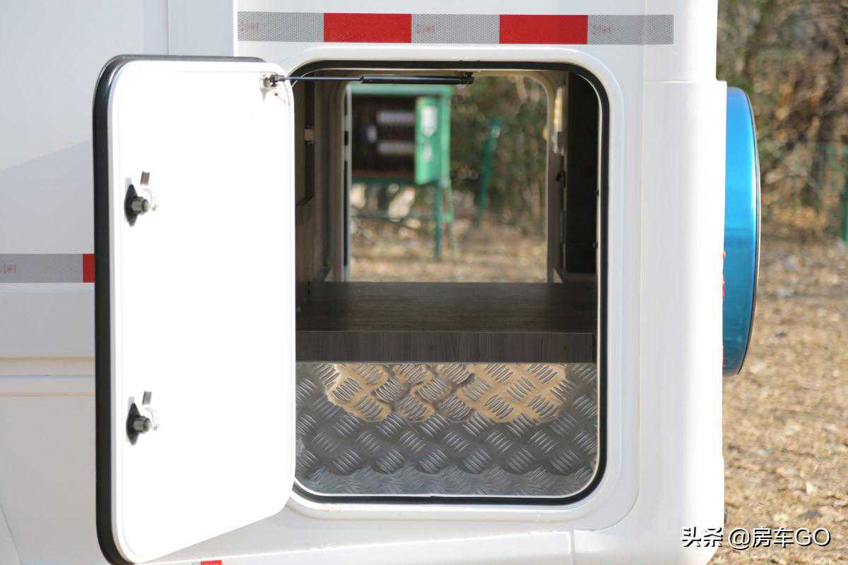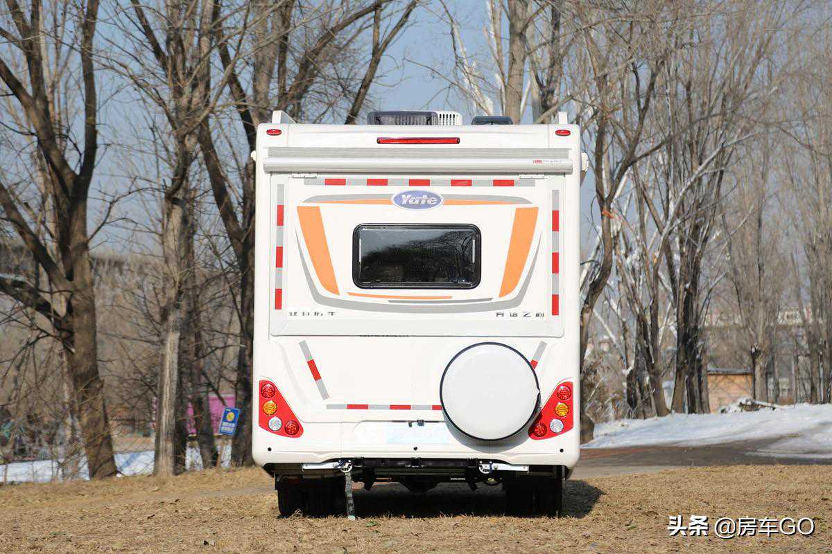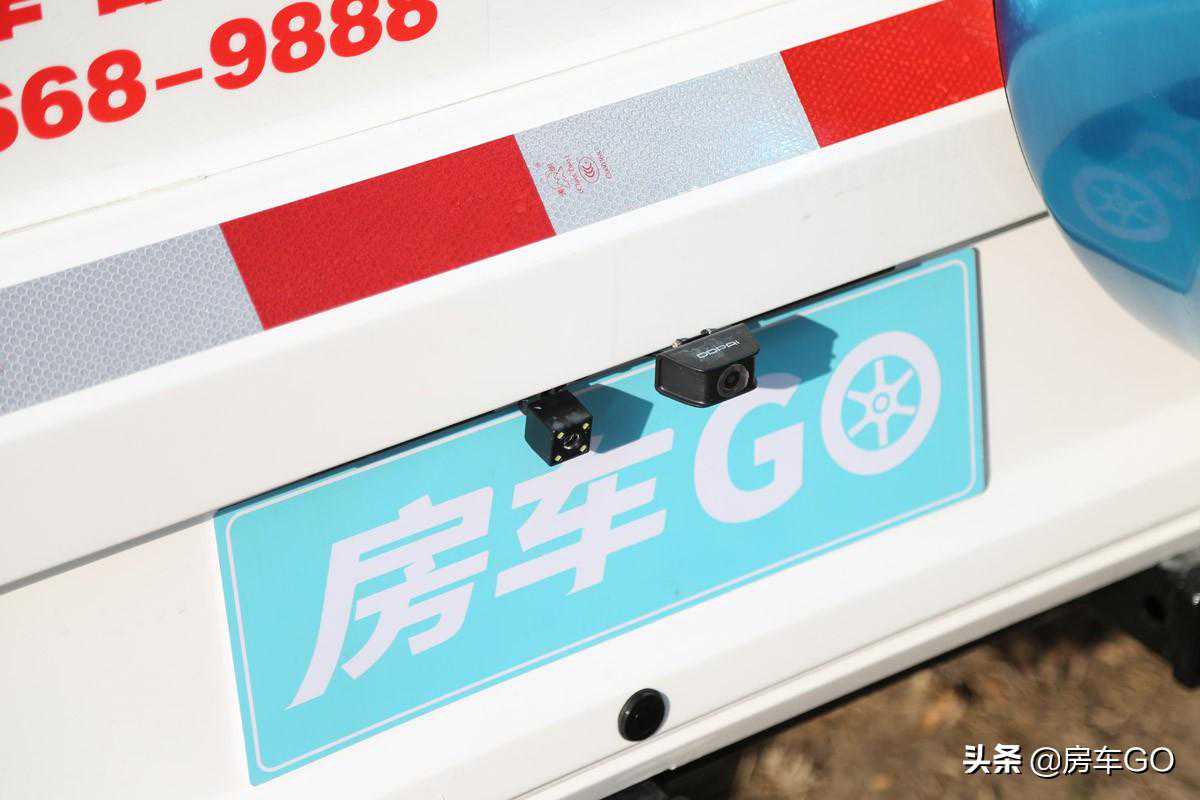 车辆后轮为双排轮结构,承载力满足房车使用需求;尾部配备有倒车雷达及倒车影像,还有监控摄像头,停在野外更加安全。