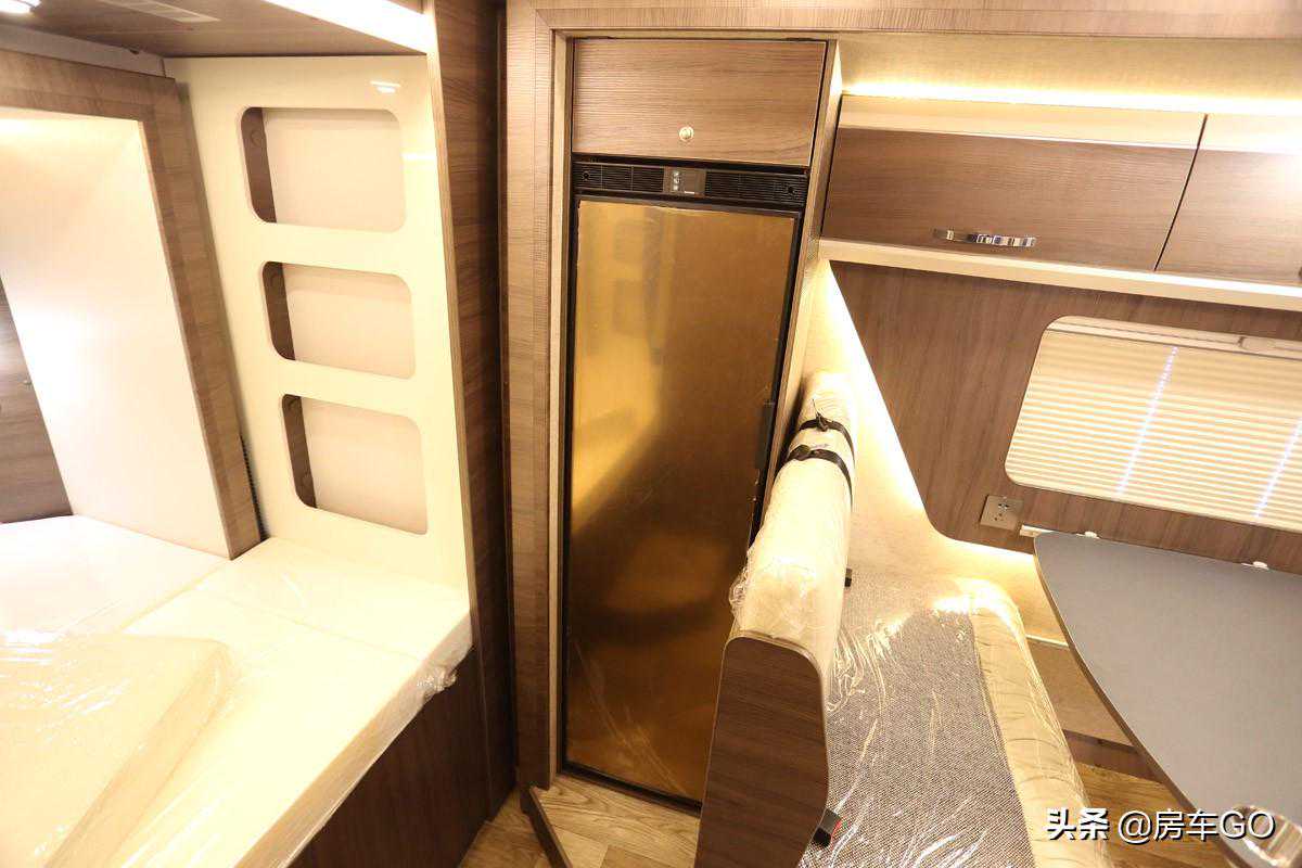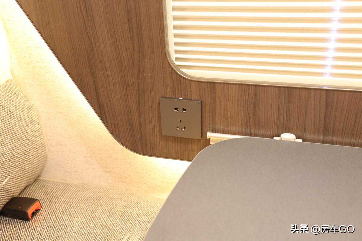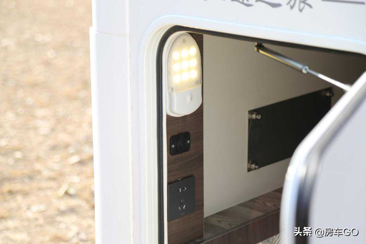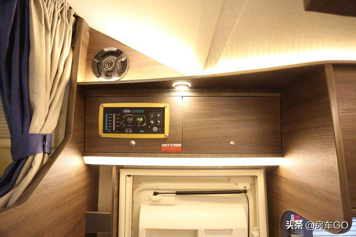 控制面板也位于乘客门上方,可查看车辆水路以及电路的用量状态,侧面是电视、冰箱、水泵以及总开关等。水路方面搭载180升净水箱、40升灰水箱;电路方面搭载200Ah电瓶以及3000W充逆变一体机。