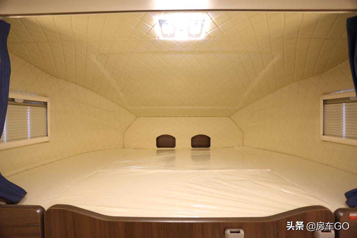 额头床区域空间开阔,经测量床垂直高度为77厘米,床铺尺寸2.2×1.5米,可容纳两名成年人休息。床铺两侧安装有外推窗,如果想要额头区域有更多阳光以及更好的视野,可选配天窗。墙壁四周采用了菱形软包材质包覆,能够触碰到的地方都是软的。
