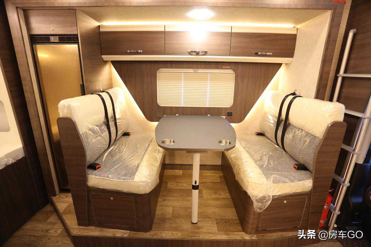 会客区位于车辆的侧拓展内,拥有完整的客厅,采用对坐式卡座沙发设计,可乘坐四名乘客,四个座位都配备有安全带,整车核载6人。桌面也设计有4处杯架,旅途中可固定水杯,同时餐桌支持拆卸,降低后可与沙发拼成一张1.9×0.9米的沙发床。