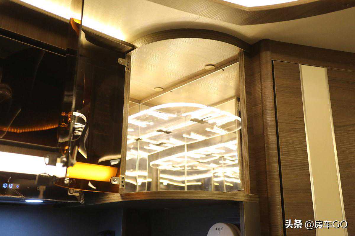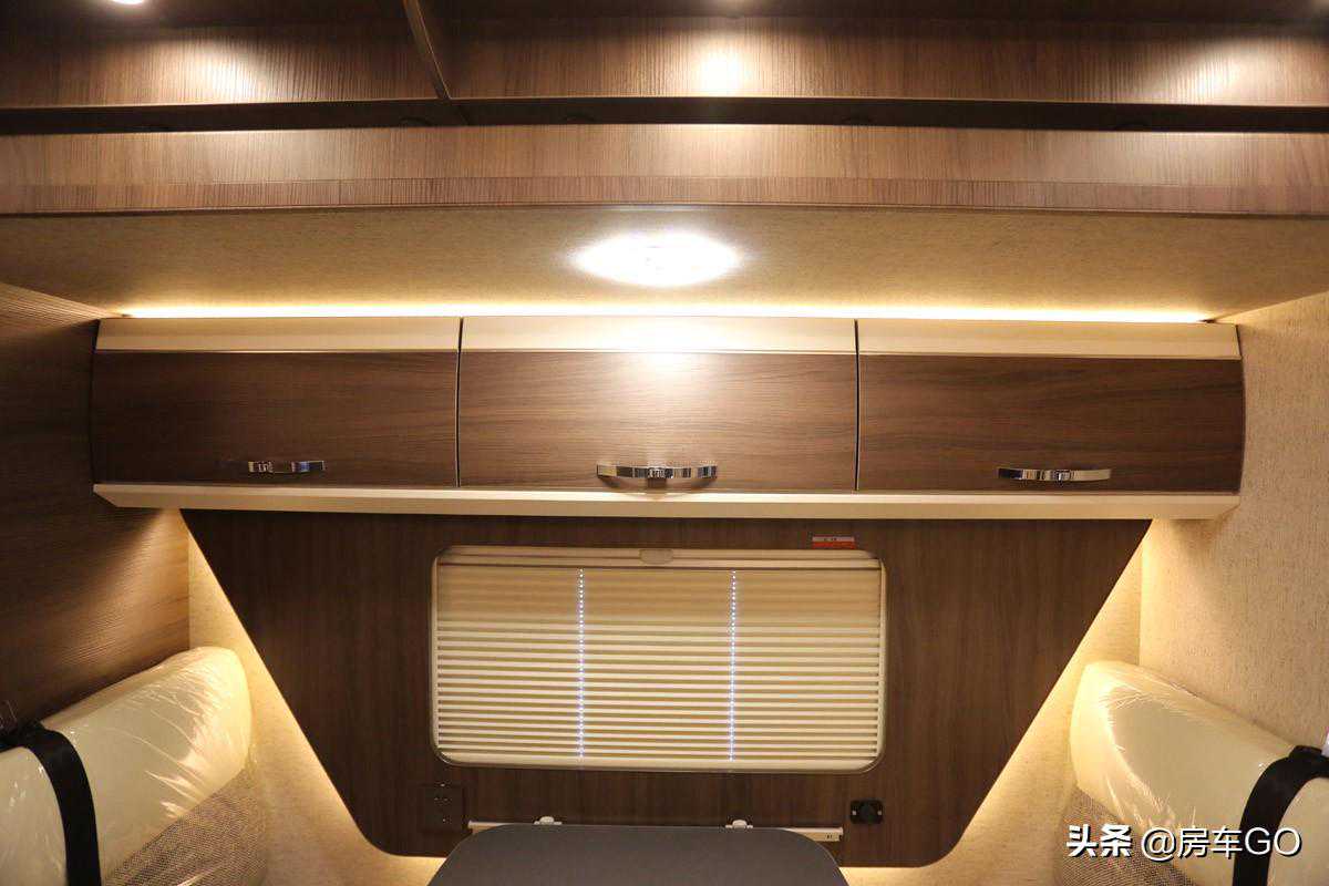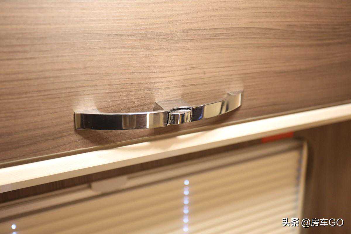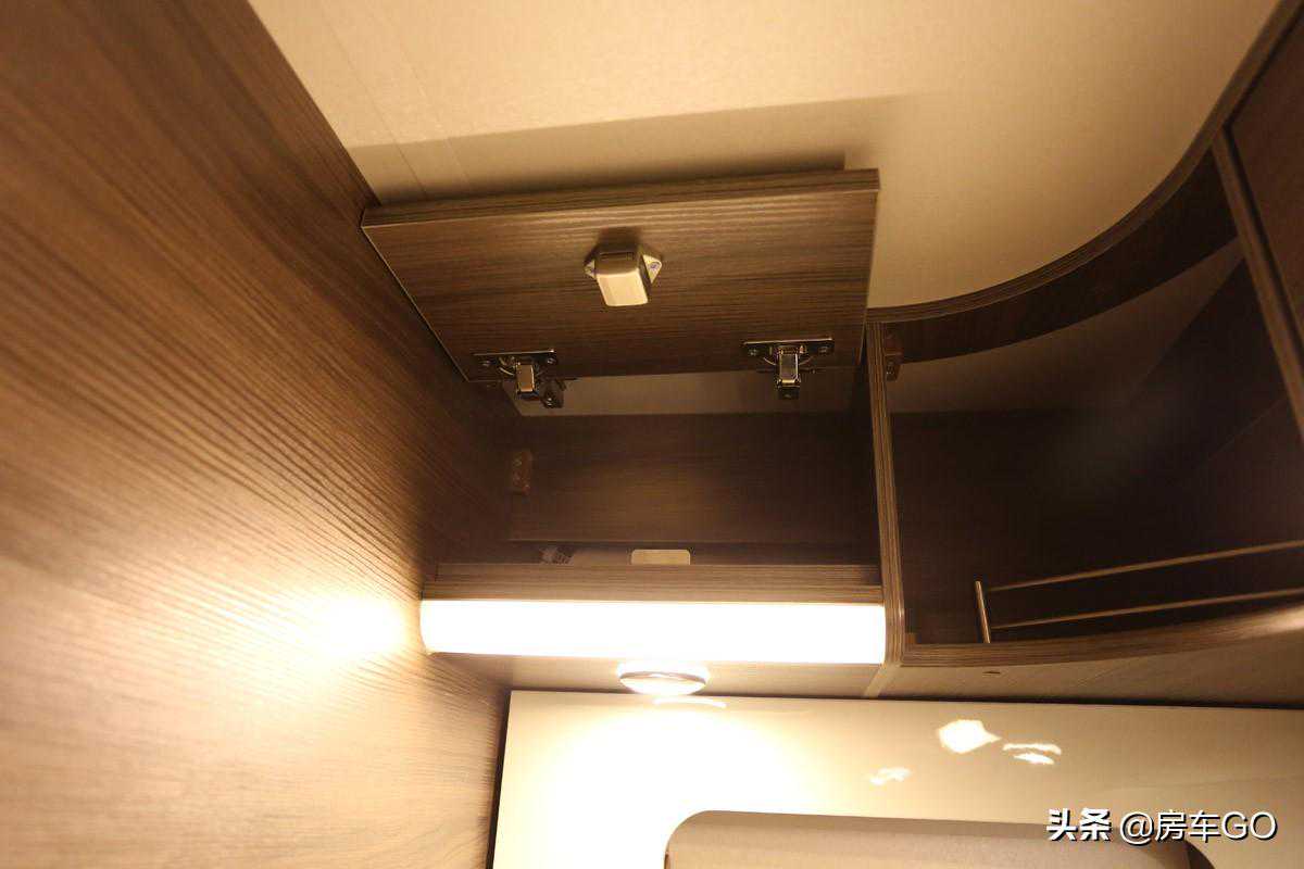 客厅上方也设计有三处顶置柜,柜门带有锁扣设计,防止车辆行进过程中物品的坠落。
