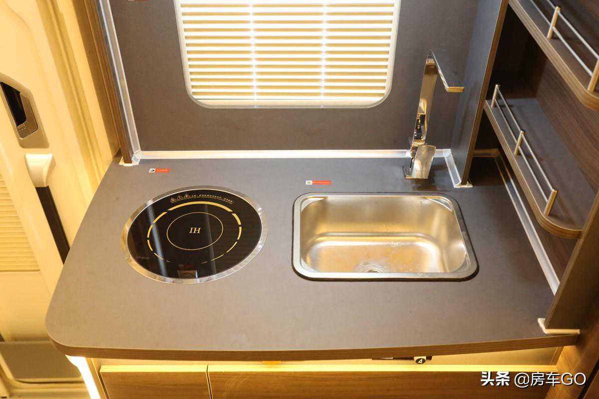 来到厨房区,台面搭载志高1200W电磁炉,采用220V供电;侧面搭载金属洗菜池,配独立水龙头。值得一提的是,车辆的水泵采用美国进口赛福乐水泵带前置过滤器,水路管件系统也采用德国进口REICH品牌。