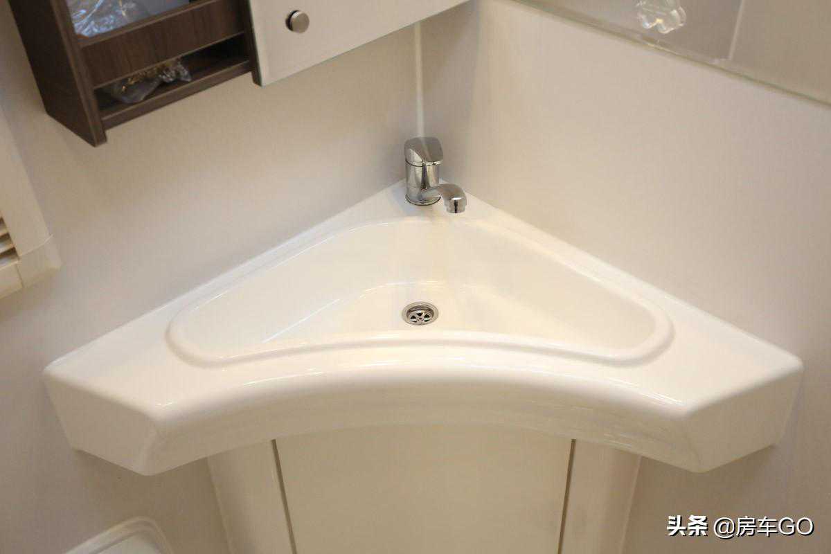 洗手池位于墙角处,容积非常大,这样洗手时水不会溅得到处都是。