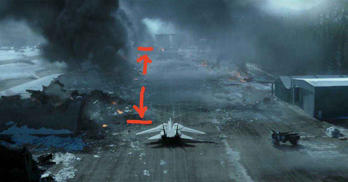 然后叔侄俩开着飞机就准备胜利大逃杀了,结果发现自己坑了自己,跑道被自家的战斧导弹炸了个稀烂。于是阿Tome哥给侄子炫了个大活,F14是可变后掠翼战斗机,虽然机翼后掠角是电脑控制的,但是可以手动把后掠度开到最小,在第一部里,这个操作叫Break,这个后面还会提到。