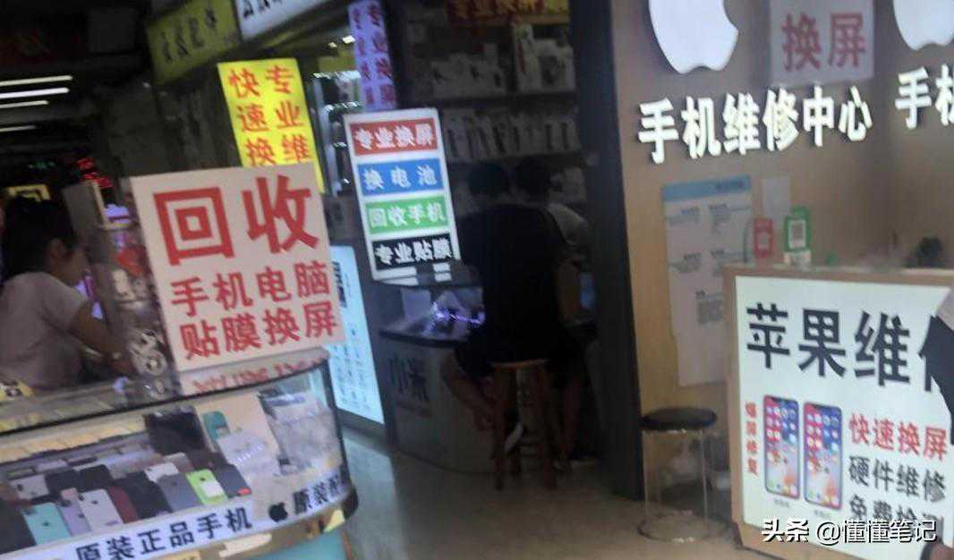 在华强北经营二手机柜台的刘兑(化名)向懂懂笔记透露:在五、六年前,赛格和远望商城里面到处都是卖二手机的一米柜台。如今,仅存的二手机一米柜台只能在部分通讯商城出入口(明显处)才能看到。