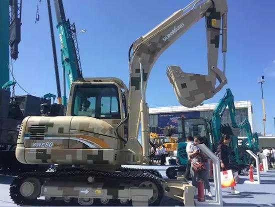 高原挖掘机SWE80E-G:作为军方某部队指定挖掘机,曾经在2013年11月进行的完全由军方主导的西藏高原工况应用测试中,在油耗、效率等6项主要指标中均领先于竞争对手,最后一举进入军方采购目录。此次也是高原挖掘机首次参加北京展。