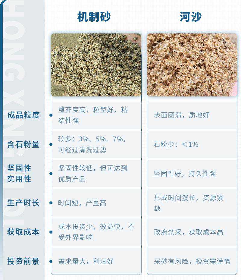生产机砂成本投资少,效益快,不限制地形,不受外界影响,而河砂政府禁采,获取成本高,因此价格也贵。