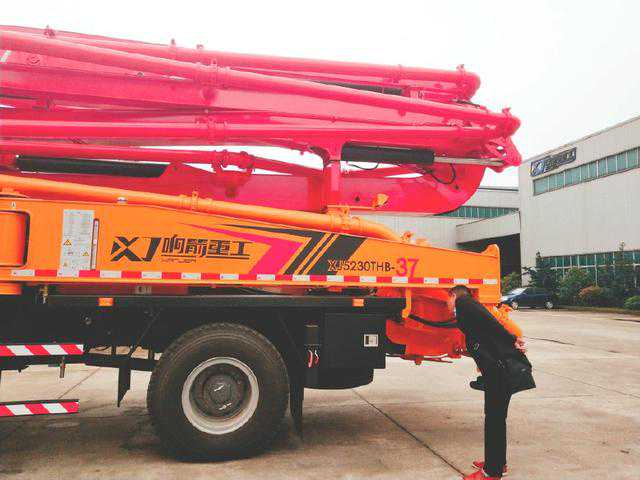 第二,根据车辆的重量识别类型和臂架长度,重量小于16吨的为车载泵,重量在16-25吨的为两桥泵车,一般为37米以下泵车,比如响箭重工现在最热销的明星产品——37米泵车,就是国内第一台两桥37米五节臂泵车,不仅配置高,还非常具有性价比,价格非常实惠,很适合刚刚入行搞泵车的客户们;重量在26-33吨的为三桥泵车,一般为36-49米泵车,比如三一、中联就有很多三桥泵车,在市面上也较为畅销;重量在38-44吨的为四桥泵车,一般为46-58米泵车;重量在50-60吨的为五桥泵车,一般为58-62米;重量超过60吨以上的,属于超限车辆,数量很少。