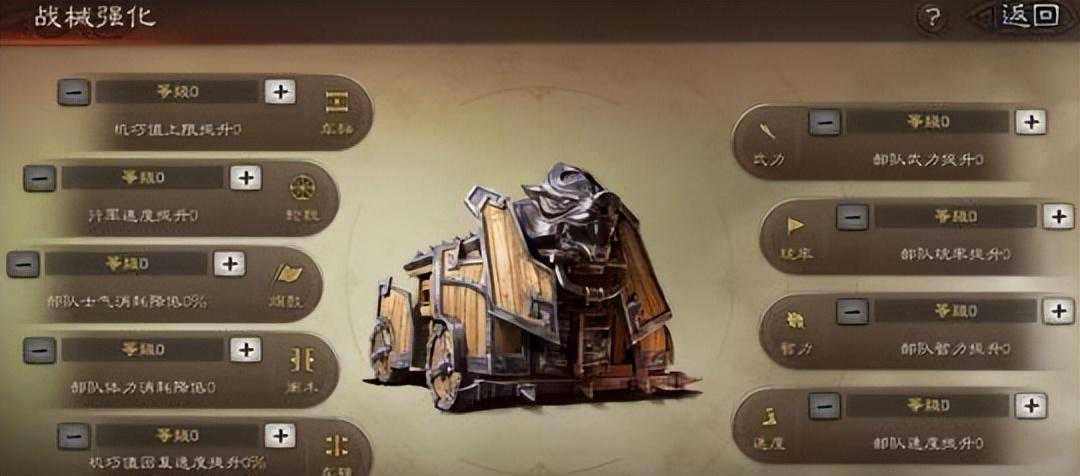 第二:我们来说一下机巧值。战械执行特殊指令每30分钟一次。以袁绍为例子,袁绍的弩车每10分钟消耗10点机巧值进行一次射击。这时,指令耗时-50%将可以使袁绍的弩车从10分钟射击一次,变为5分钟射击一次。我个人认为,这可是质变,十分推荐再消耗10点机工值,点满指令耗时!