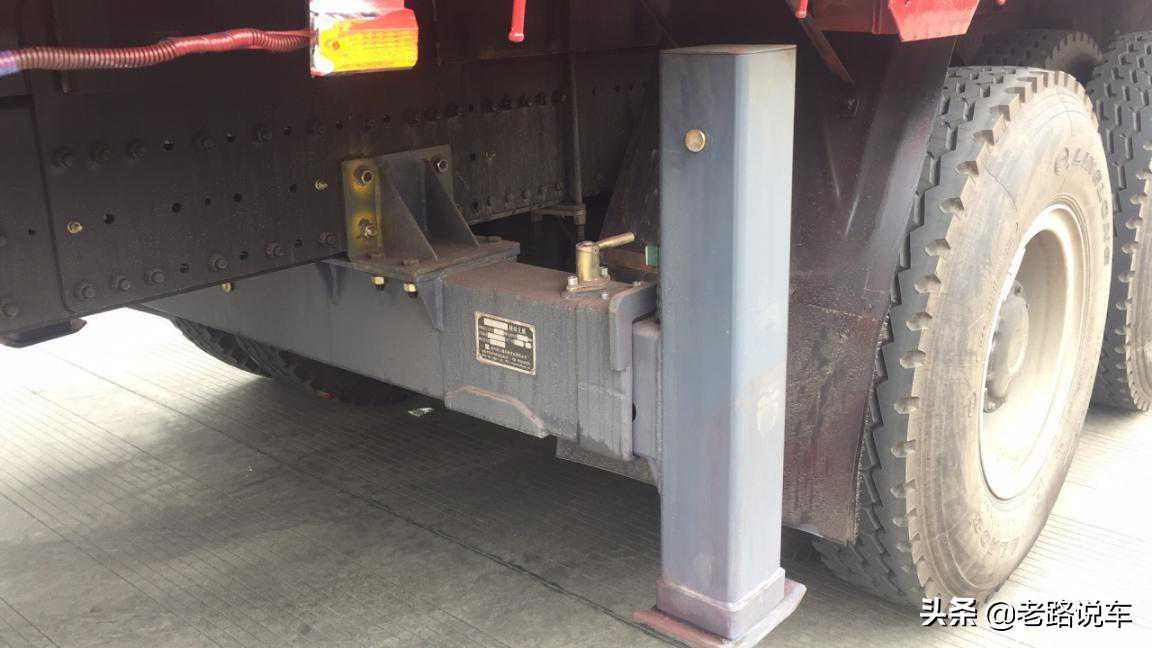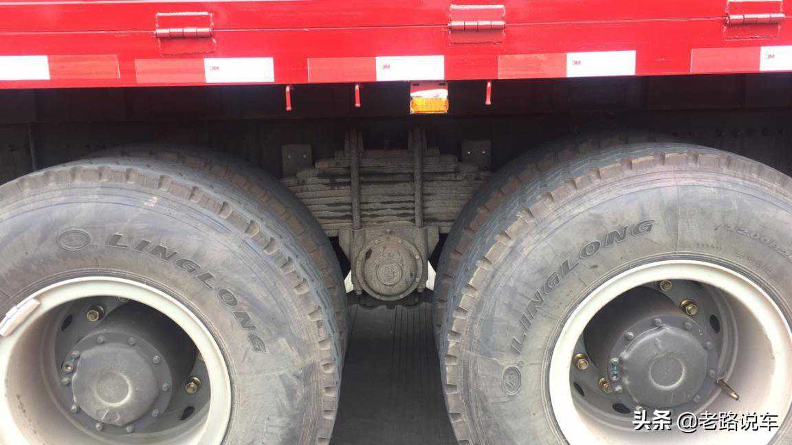 前面我们也说到了,车辆运输的货物偶尔会超载,所以说还是要保证车辆的运载能力。前桥采用了一对7.5吨级别的车桥,后桥则是一对MAN技术的16吨轮边减速桥,全车使用了多片抛物线钢板弹簧悬挂。轮边减速桥使得车辆的离地间隙提高,通过性更好。且较大的主减速比,也能够输出更大的扭矩,适应复杂工况的运输。该车配备的是12.00R20的钢丝胎,也是重载运输的配置。