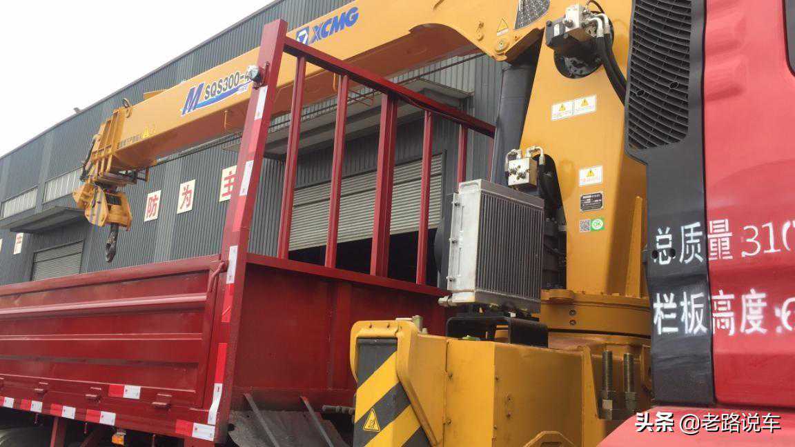吊臂采用了徐工的SQS300-4直臂随车吊,吊装重量为12吨,具备四节伸展吊臂,主臂可以360°旋转。该吊臂的工作半径为12.5米,而吊装重量也是根据工作半径来定的,半径越大吊装重量越小,工作半径为12.5米时的吊装重量1.8吨;而工作半径为2.5米的时候可以吊装12吨的货物。