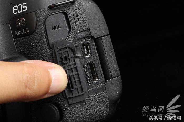 在接口上,佳能EOS6DMarkII的数据接口仍然是四个,由于翻折屏以及NFC模块加入的缘故,机身侧面已经不允许将接口设计成两排排列了,所以佳能的工业设计师也是巧妙的将接口进行了合理的安排,这样就有足够的位置来放置NFC模块和扬声器。