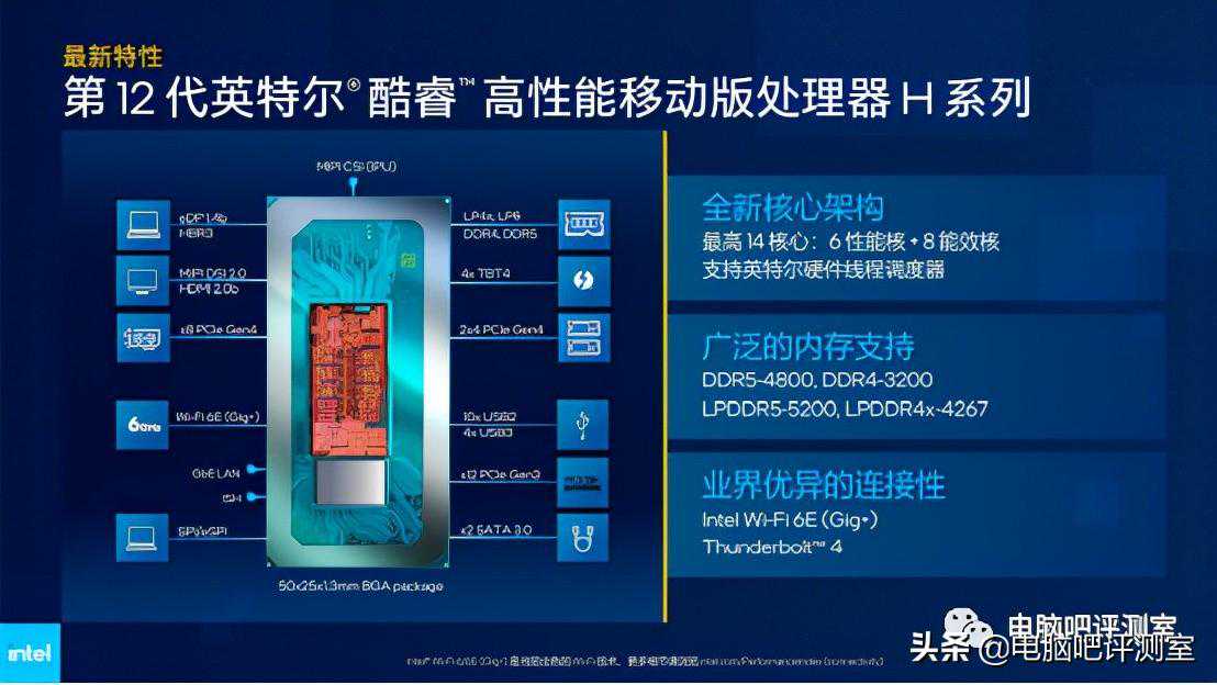 H系列特性比较丰富,也是在各大系列中(除台式机外)可拓展性最强的,以PCI-E为例,它支持1条*8(直连独显)、2条*4(直连2个)以及12条通道用于拓展其他外围设备;支持、HBR3、、四个Thunderbolt4、四个、十个以及两个SATA6Gbps,内存则可以支持标准DDR4/DDR5以及LP4x/LP5,属于满血版产品。