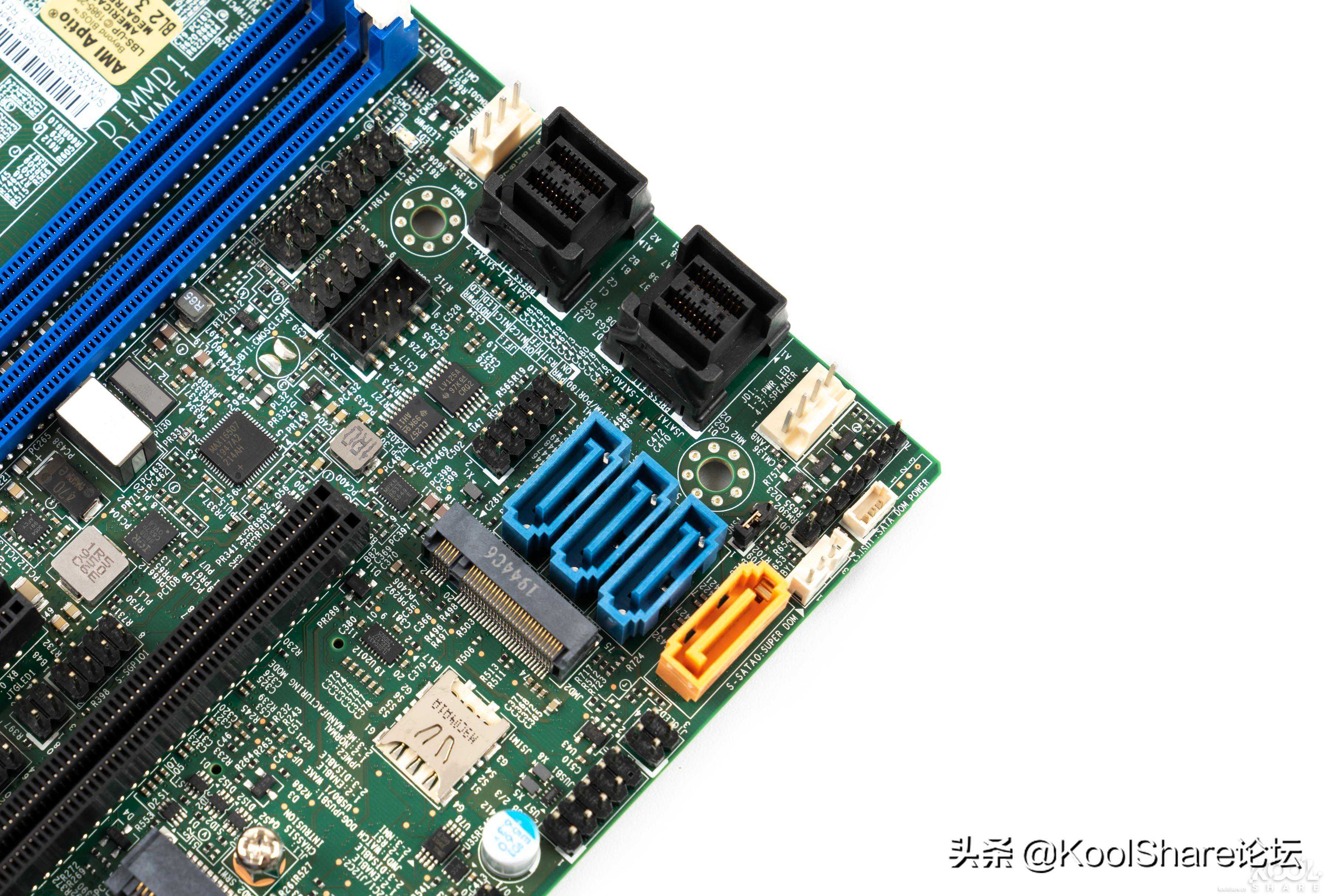 ▲右上方是Mini-PCI-E转mSATA插槽。最下方是适用于SSD的插槽,支持2280规格的NVMeSSD。AspeedAST2500,独立的ARMCPU,用于处理IPMI系统数据,同时为VGA接口提供支持。MX25L25635FMI,FLASH芯片,容量大小为32MB。K4A4G165WE-BCRC,DDR4RAM芯片,电压为1.2V,速率为2400Mbps,容量大小为512MB
