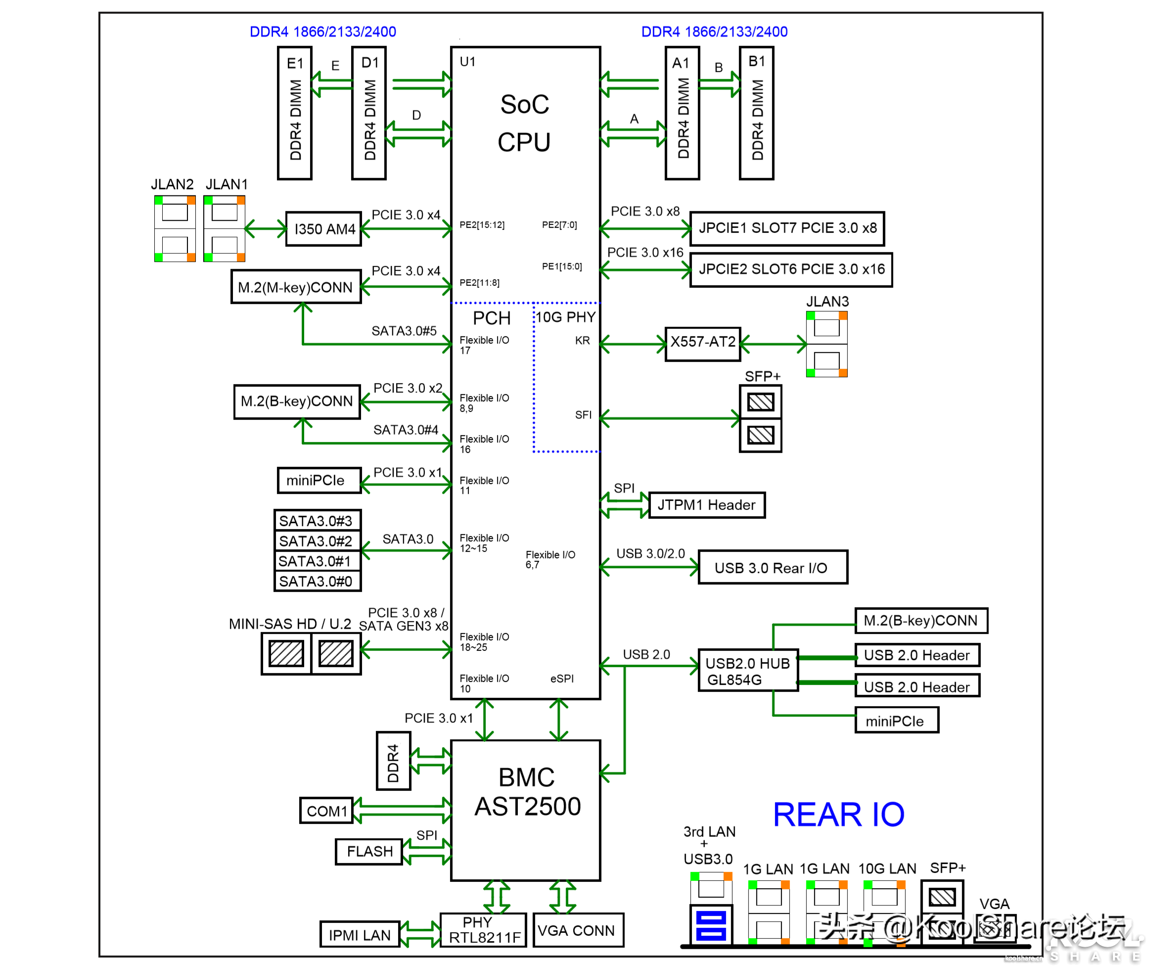 ▲主板芯片示意图。这块主板和我之前E300-9D-8CN8TP上那块X11SDV-8C-TP8F除了CPUSoC不一样之外,其他地方都一样