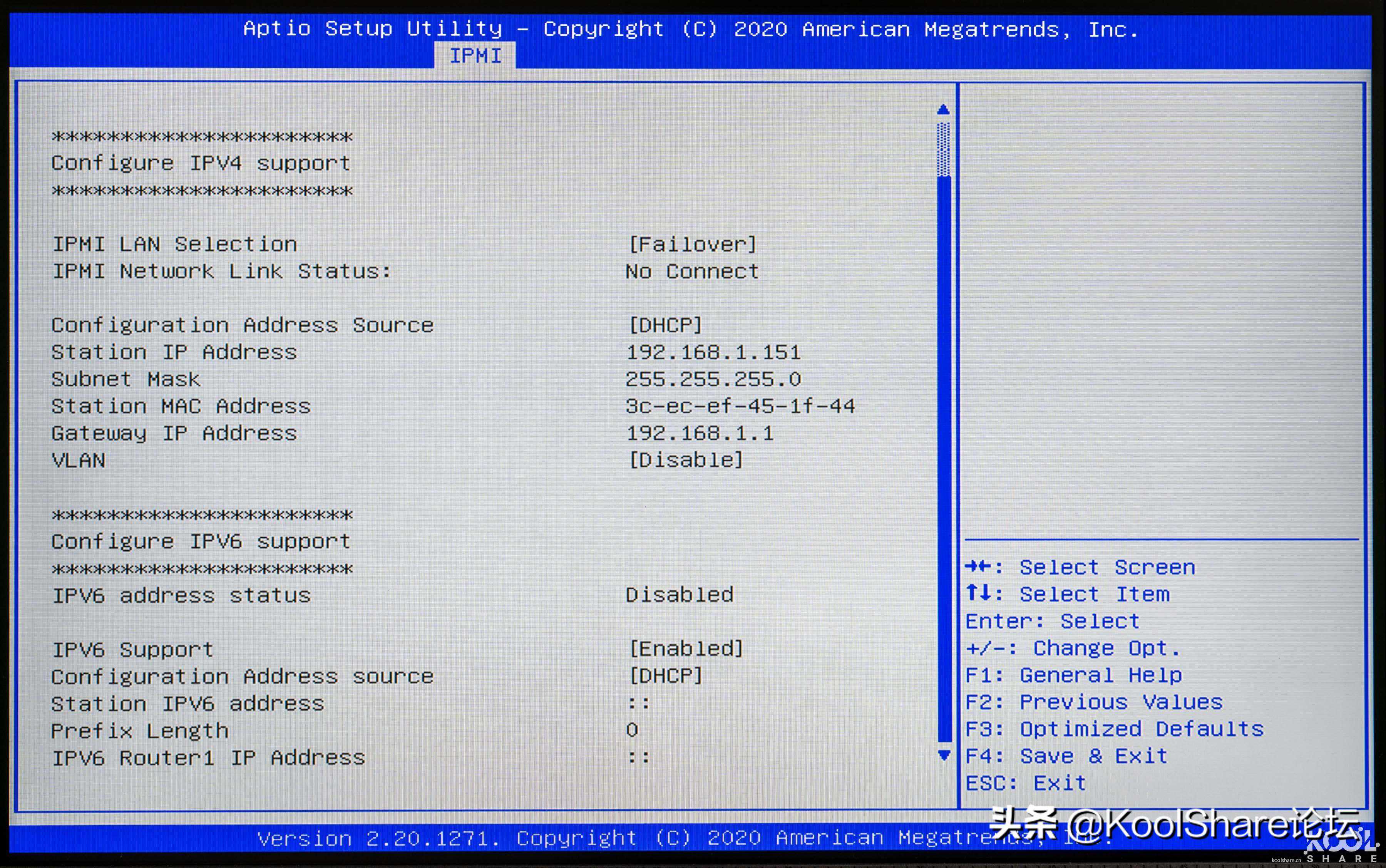 ▲IPMI管理接口的IP地址可以是以DHCP方式获取或者是静态IP。在这里我将其配置成静态IP,方便后期直接接入管理
