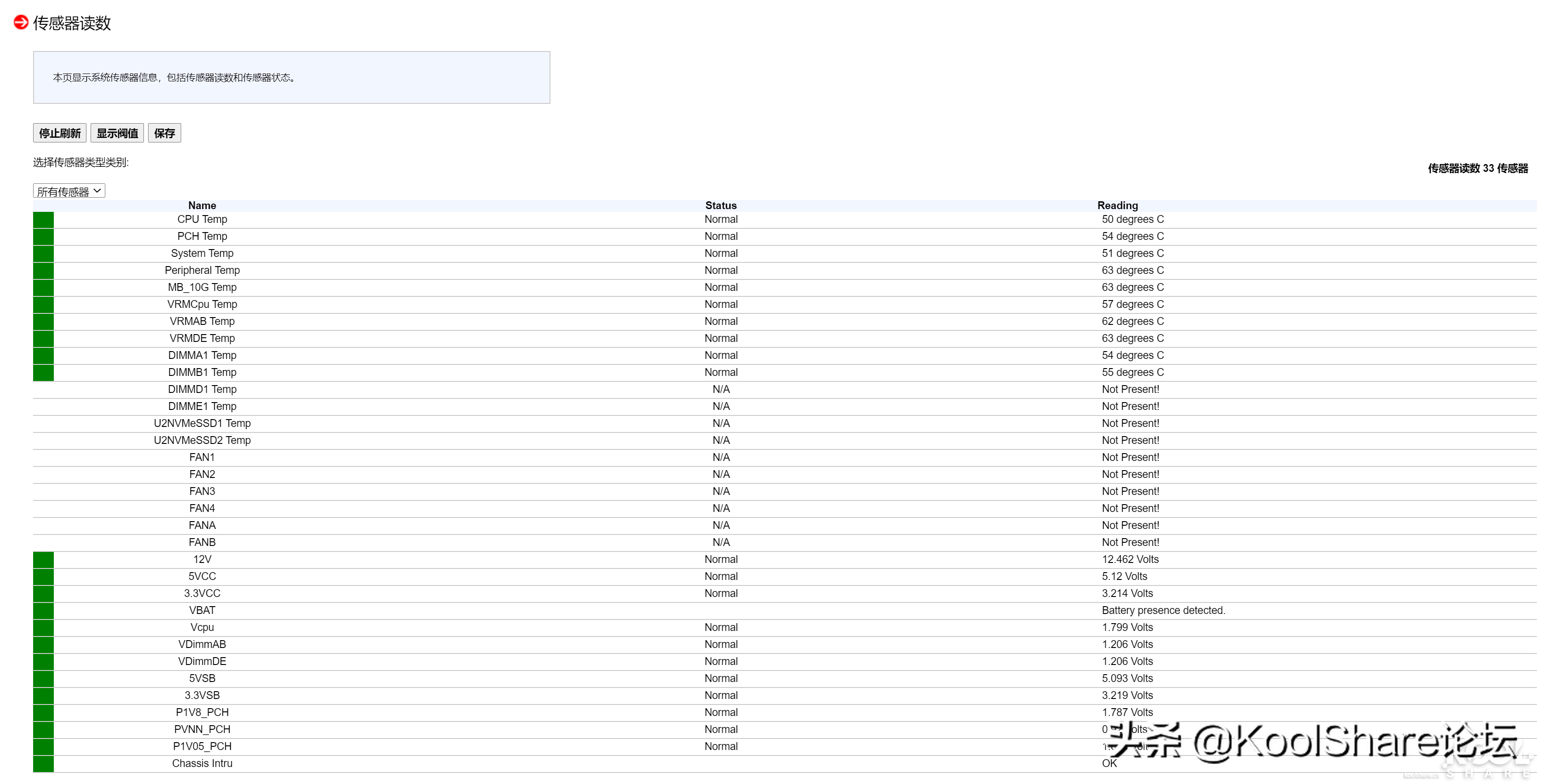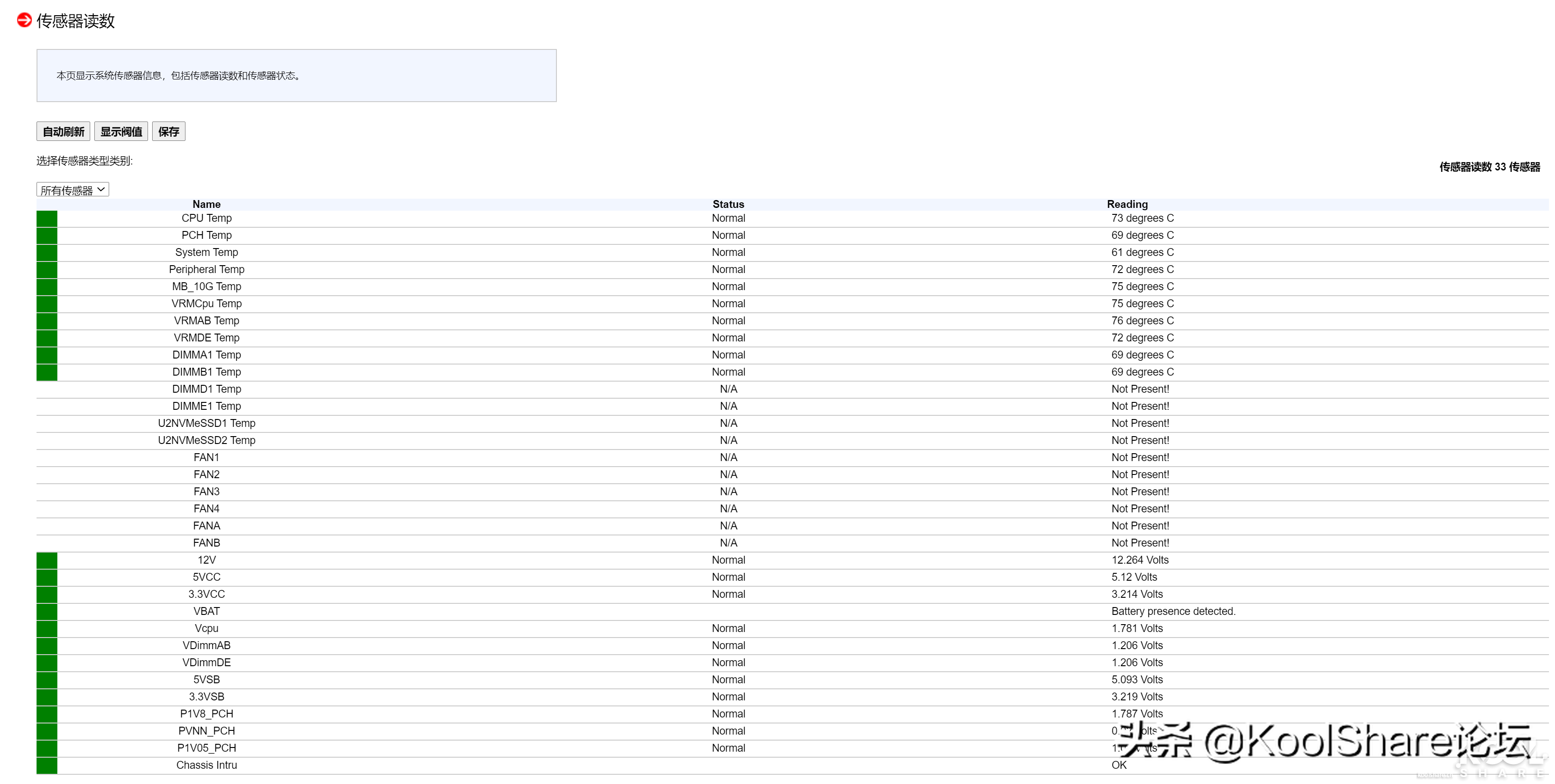 ▲传感器读取信息中可以查看当前的所有设备温度以及风扇转速和12V、5V、3V电压