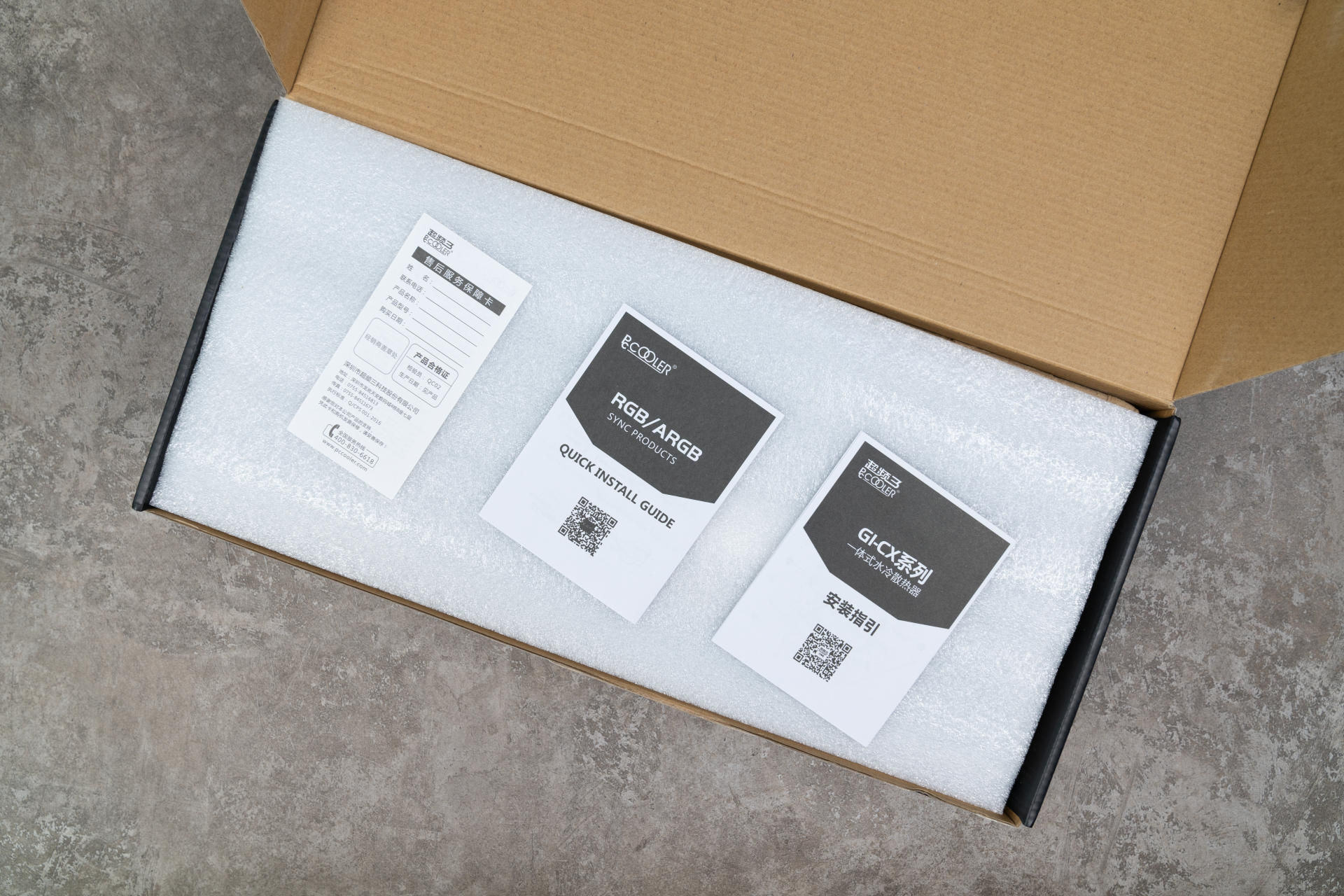 ▲打开包装就能看见一张保修卡,RGB快速安装指南和水冷安装指引,安装前请记得仔细阅读。