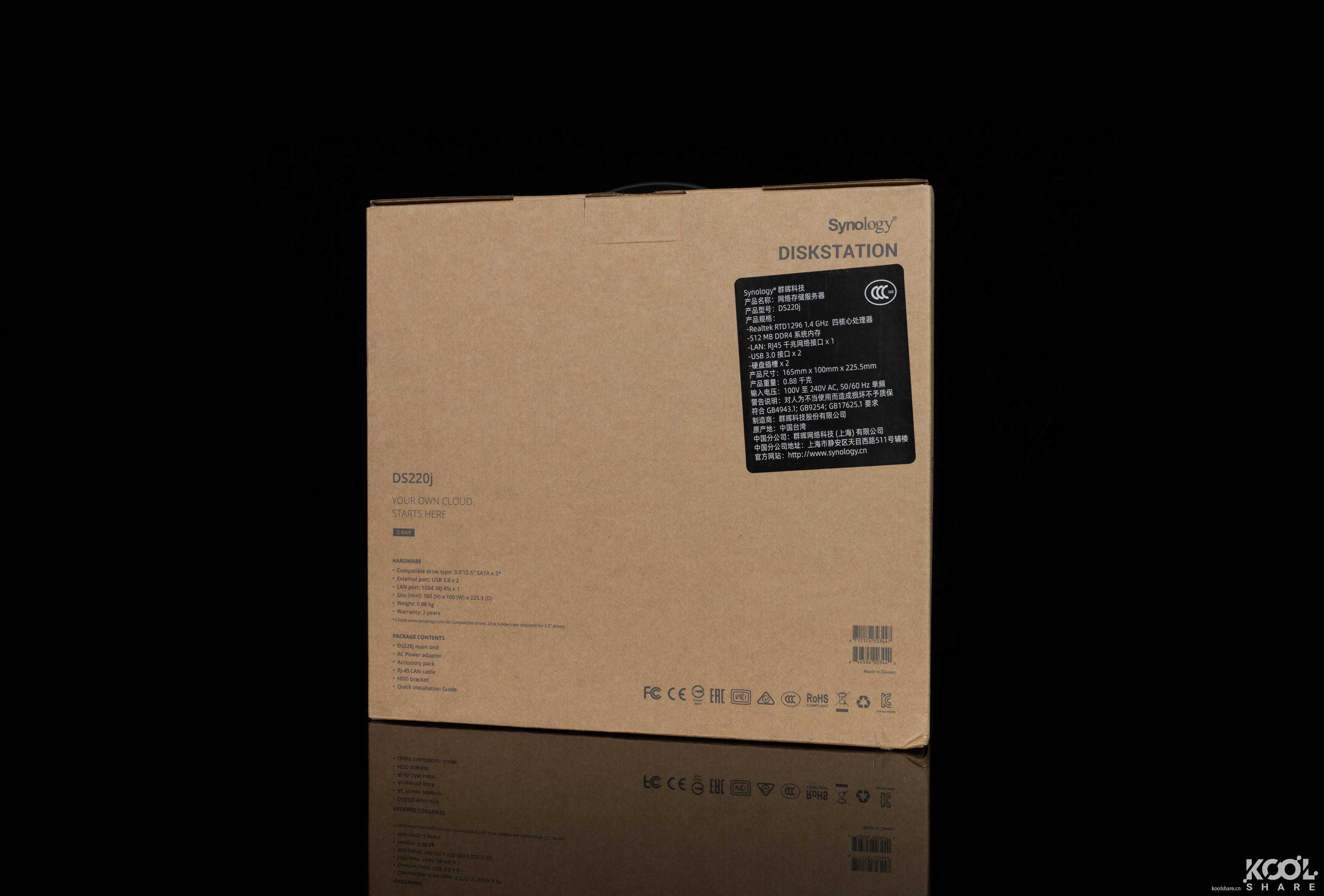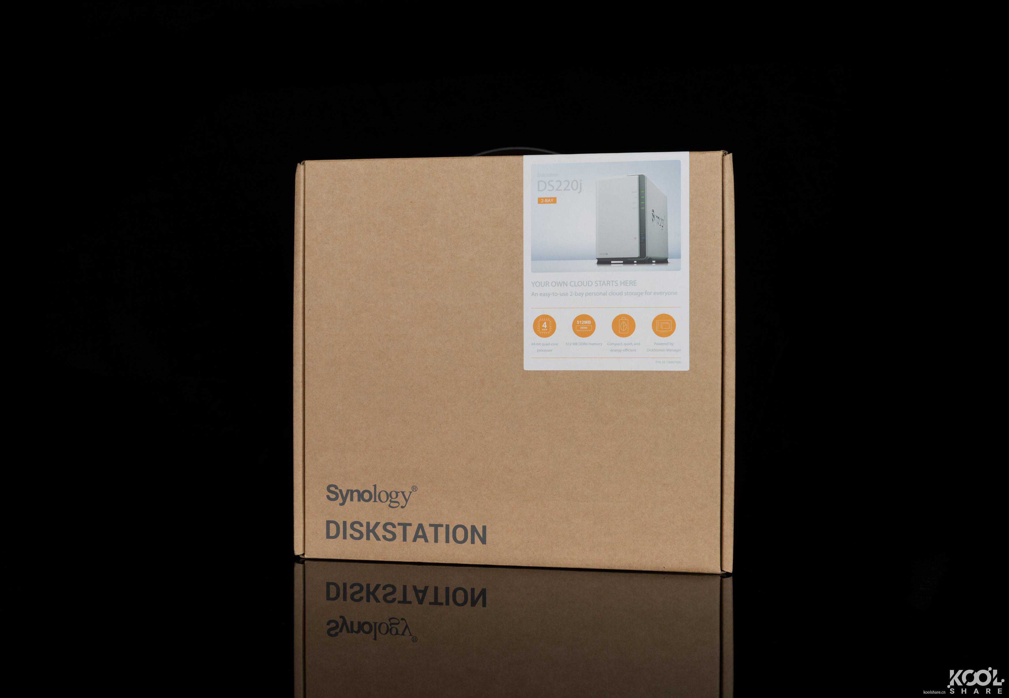 ▲DS220j采用牛皮纸盒子包装。正面右上角张贴了NAS的型号和规格